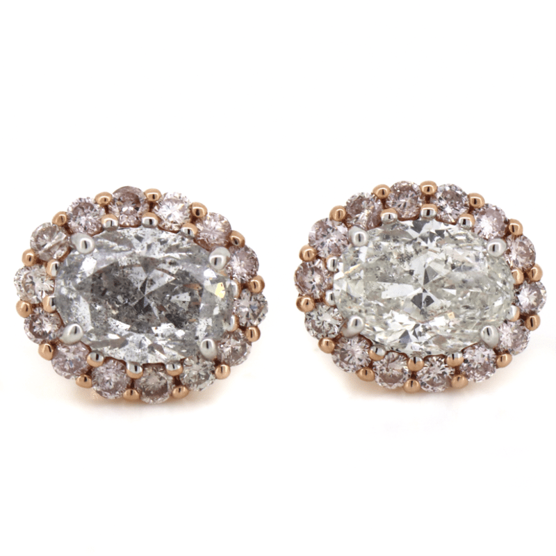 The Centre Features, 2 Oval Brilliant Cut, Diamond (2.02Ct Tdw, H Colour, I2 Clarity), Claw Set. Encompassing The Centre In A Halo Are, 28 Round Brilliant Cut, Fancy Pink Diamond (0.60Ct Tdw, Fancy Light Champagne Pink And Purplish Pink, Si-I2 Clarity), Claw Set. The Earrings Feature Standard Post Butterfly Posts.