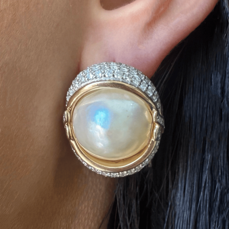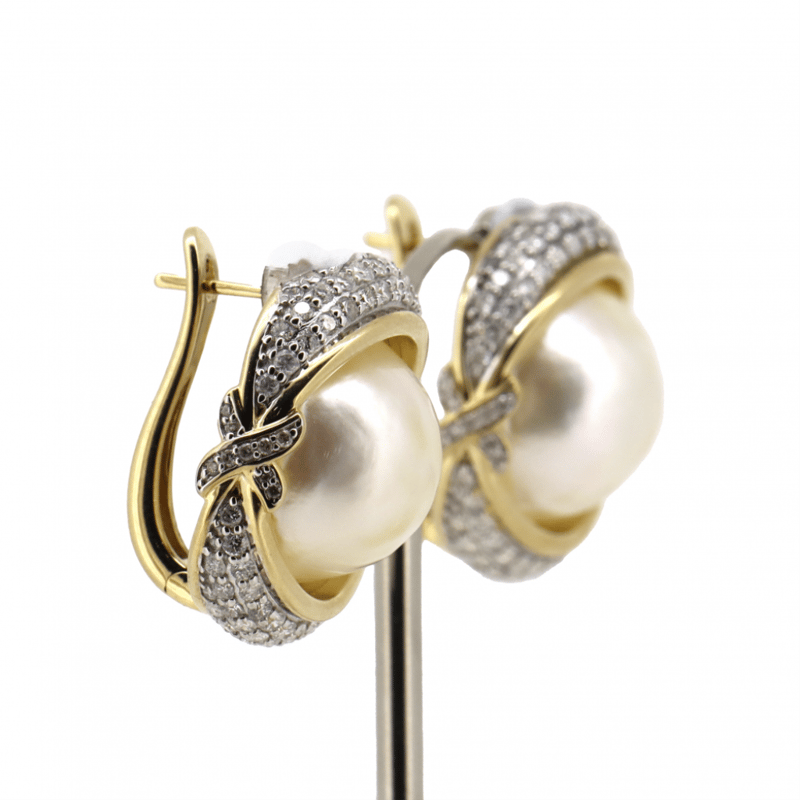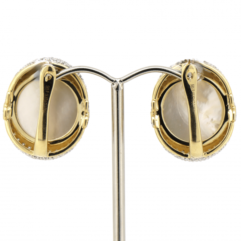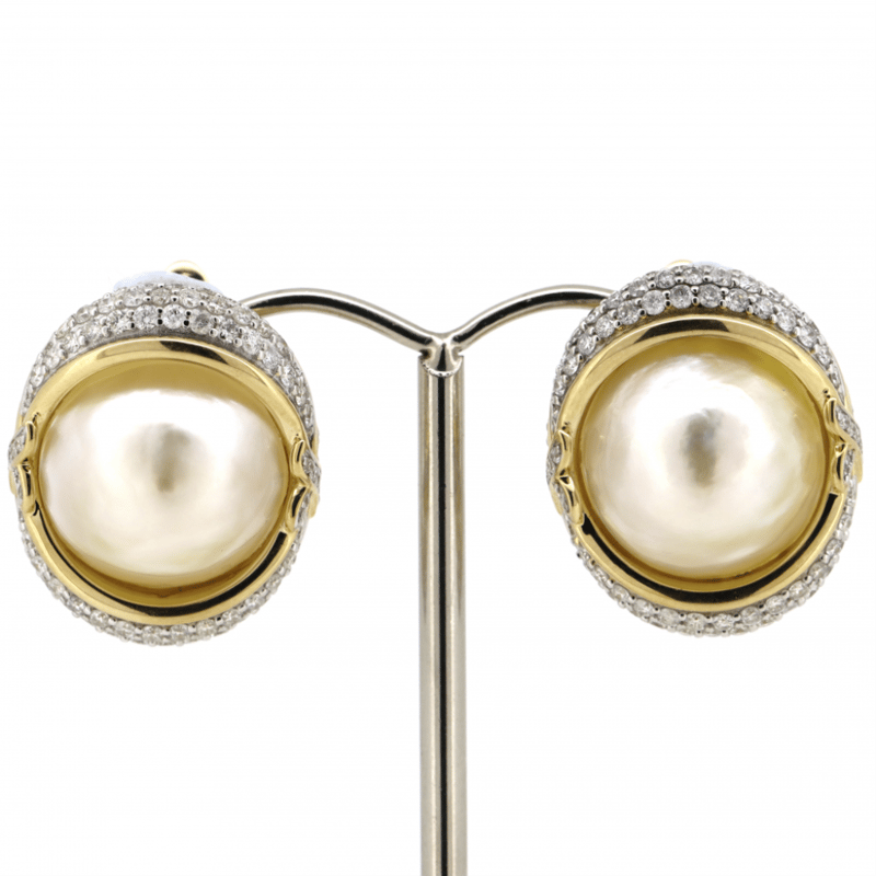 The Centre Features, 2 Half Round Dome, Cream With Gold Overtone, Cultured Mabe Pearls (18.87Ct Tsw, Good Lustre), Bezel/Adhesive Halo Mount Set. Surrounding The Design Are, 180 Round Brilliant Cut, Diamonds (2.09Ct Tdw, G-H Colour, Vs2-Si1 Clarity), Bead Style Set. The Earrings Have A Hinge Lock.