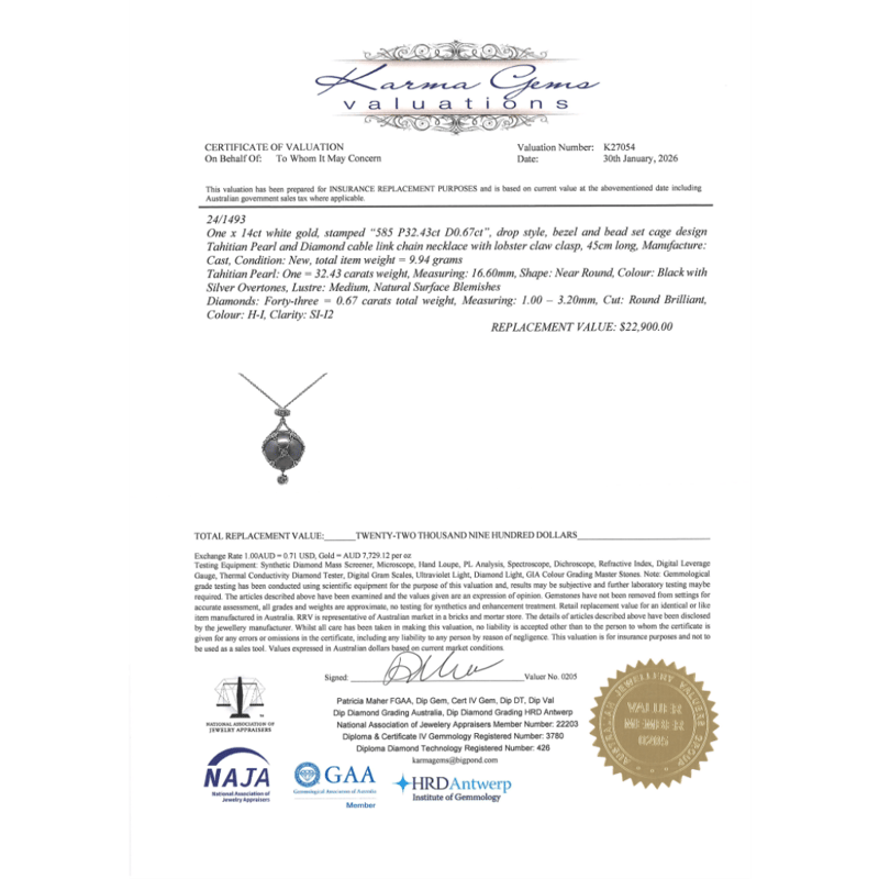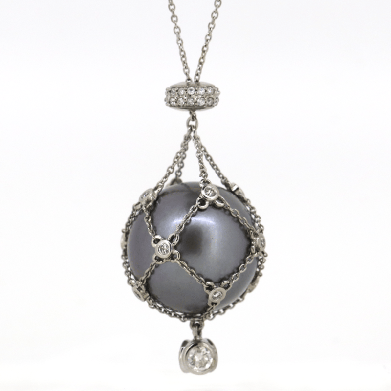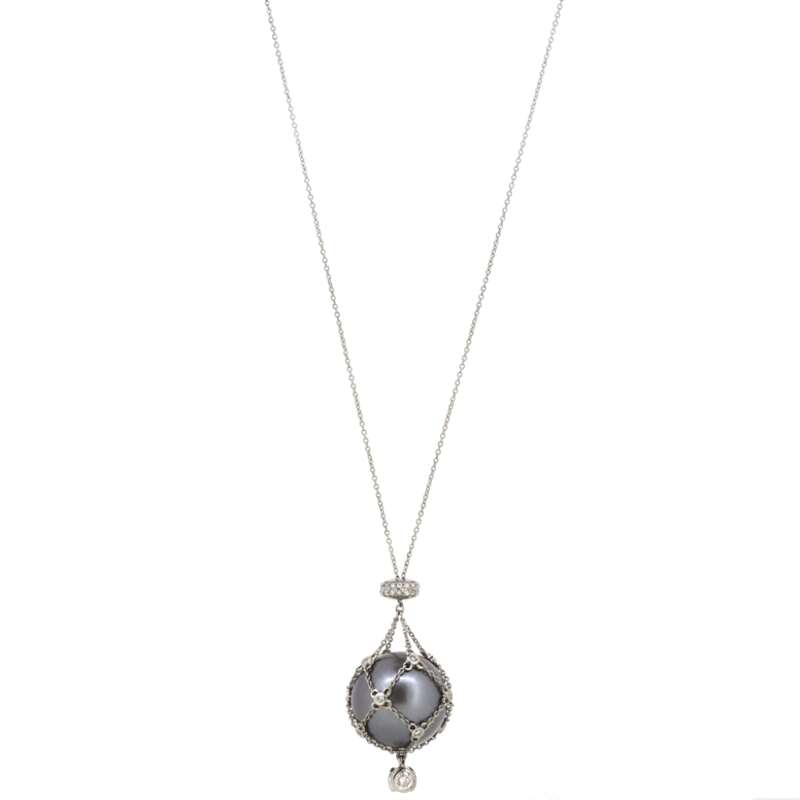 The Design Features, One Near Round, Black With Silver Overtones, Cultured Tahitian Pearl (32.43Ct, 16.60Mm Size, Medium Lustre, Natural Surface Blemishes), Unset In A "Cage" Chain. The Chain Features, 43 Round Brilliant Cut, Diamonds (0.67Ct Tdw, H-I Colour, Si-I2 Clarity) Bezel/Bead Set. The Necklace Features A Lobster Claw Clasp Closure. Necklace Length Is 45Cm.