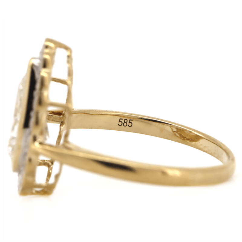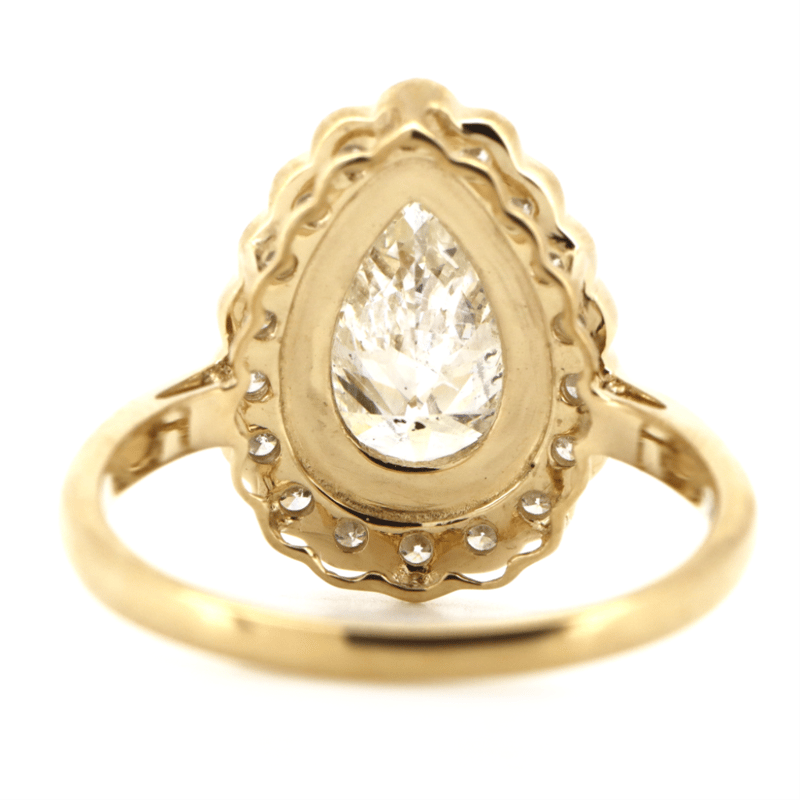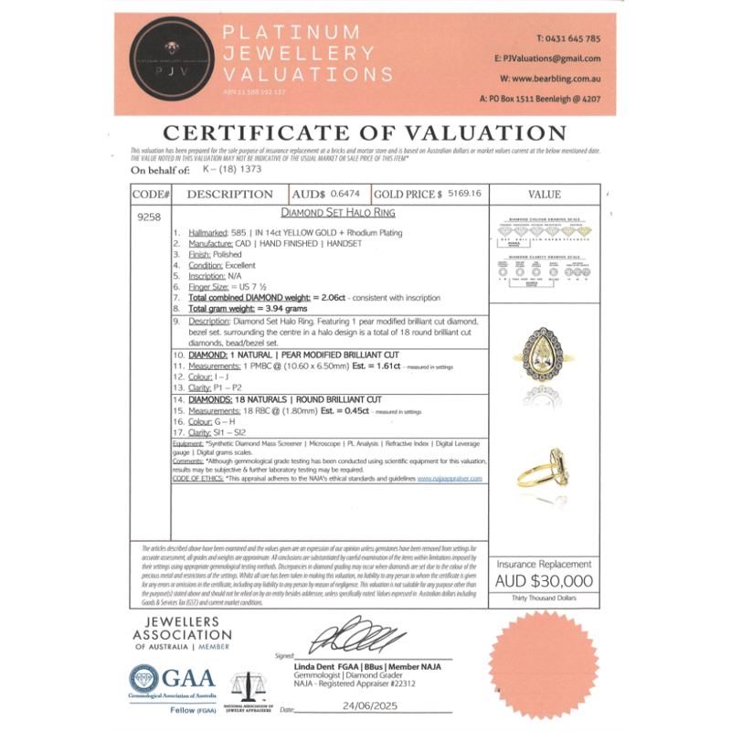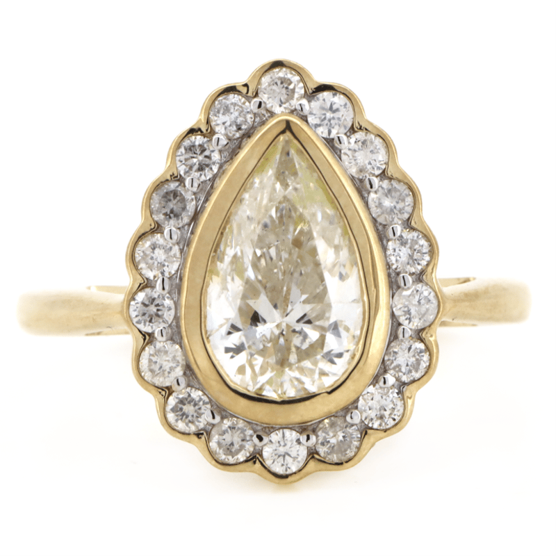 14K YELLOW GOLD AND DIAMOND, HALO RING. The Centre Features, One Pear Modified Cut, Diamond (1.61Ct, I-J Colour, Si1-Si2 Clarity), Bezel Set. Encompassing The Centre In A Halo Are, 18 Round Brilliant Cut, Diamonds (0.45Ct Tdw, G-H Colour, Si1-Si2 Clarity), Bead/Bezel Set. Ring Size O. Valuations Provided by an Independent Third-Party Professional Not Directly Associated With Lloyds Auctions at AUD $$30,000.00This valuation has been conducted by an independent third-party professional. The valuation amount is an assessment by the issuing valuer and does not reflect the auction value of the item. Any inquiries regarding the valuation should be directed to the issuing valuer (refer to contact details on the certificate), as Lloyds Auctions has no affiliation or influence over the valuation, the valuer, or the stated amount. Condition: Good - Refer Images 0645948+5050