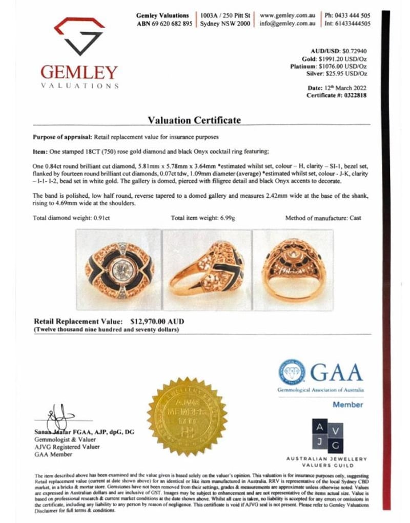 18CT ROSE GOLD ROUND BRILLIANT CUT DIAMOND AND BLACK ONYX RINGD = 0.91CtVal #0322818Condition: Good - Refer To ImagesThis valuation has been conducted by an independent third-party professional. The valuation amount is an assessment by the issuing valuer and does not reflect the auction value of the item.Any inquiries regarding the valuation should be directed to the issuing valuer (refer to contact details on the certificate), as Lloyds Auctions has no affiliation or influence over the valuation, the valuer, or the stated amount.Insurance Replacement Valuation Amount: $12,970.00488487+56