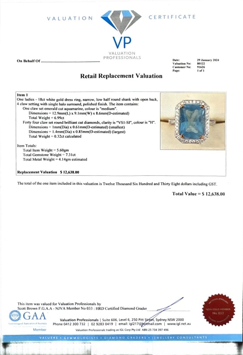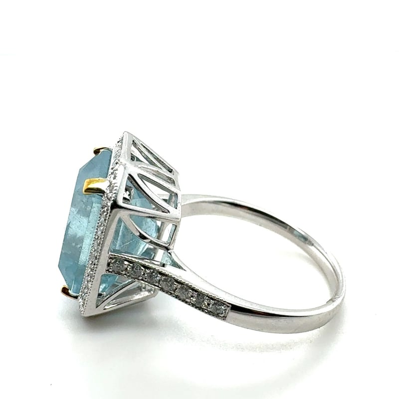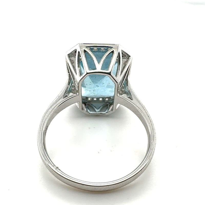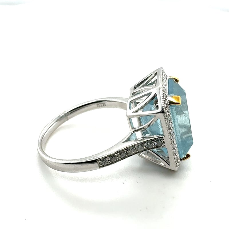 18CT WHITE GOLD EMERALD CUT AQUAMARINE AND DIAMOND RING