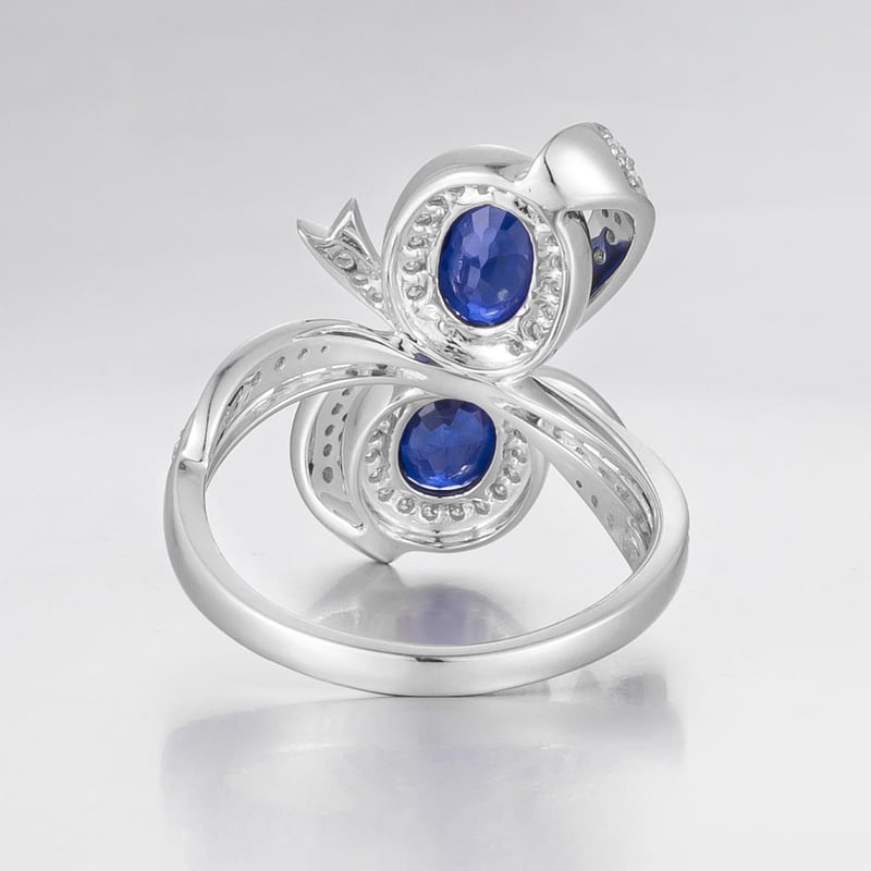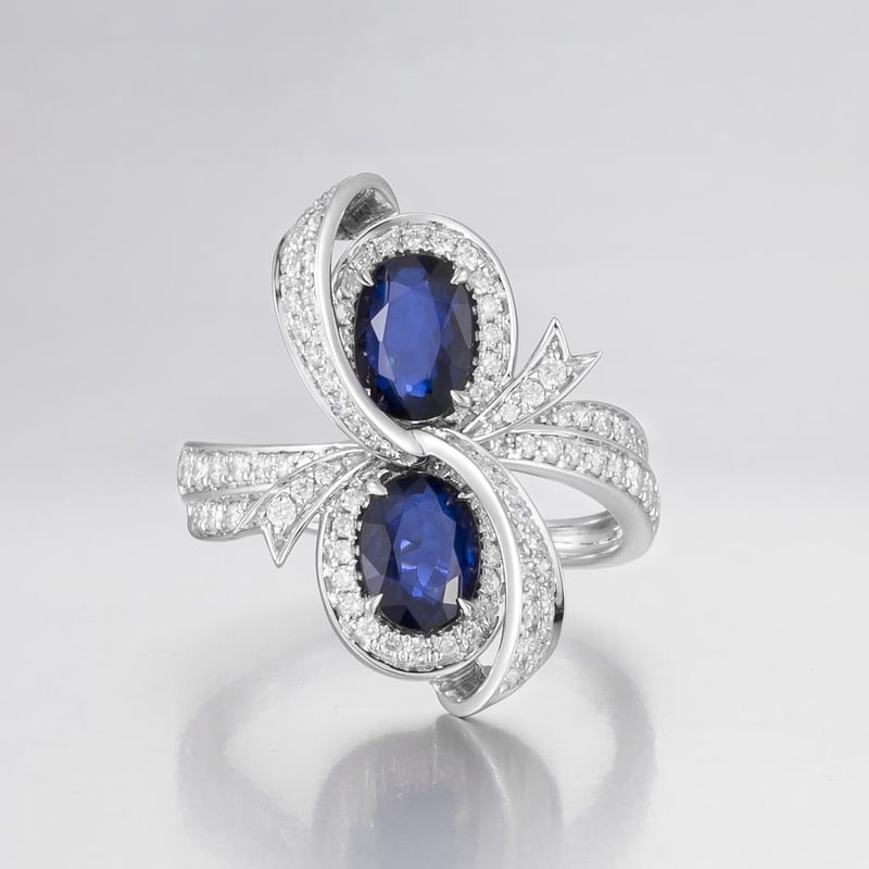 Featuring Centre, 2 Oval Cut, Dark Vivid Blue Ceylon Sapphires (1.80Ct Tsw, Moderate Inclusions), Claw Set, With 96 Round Brilliant Cut Diamonds (0.56Ct Tdw, G-H Colour, Si1-Si2 Clarity), Bead Set. Ring Size O.