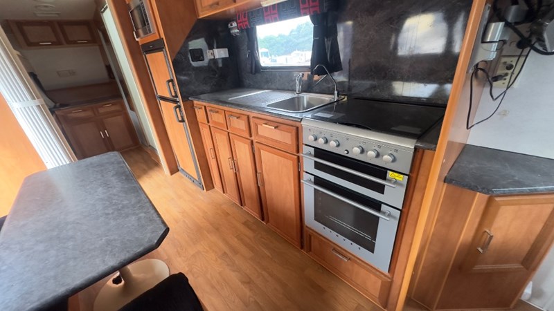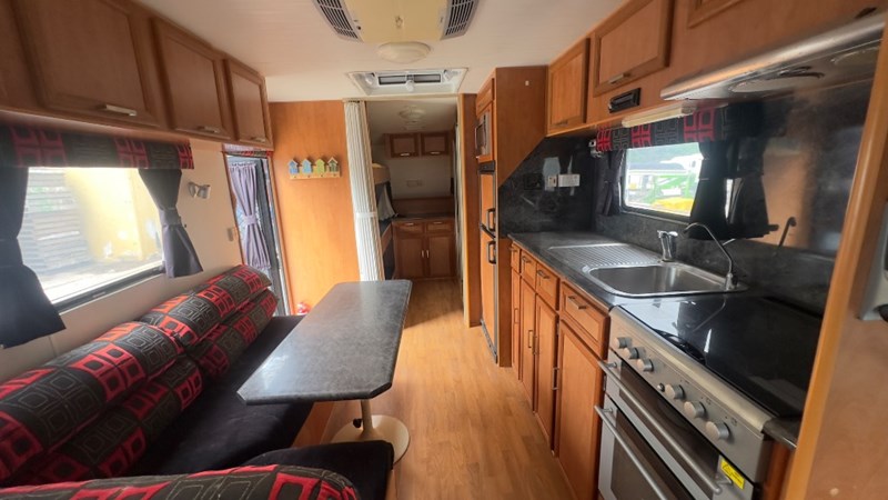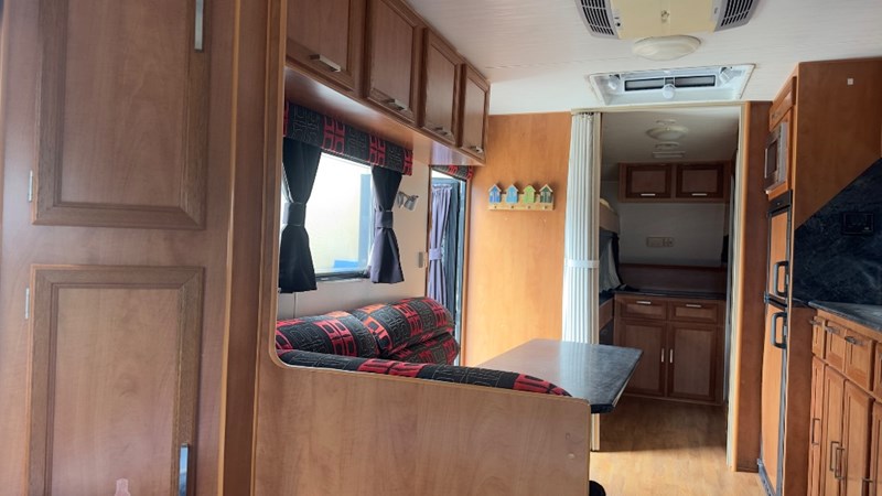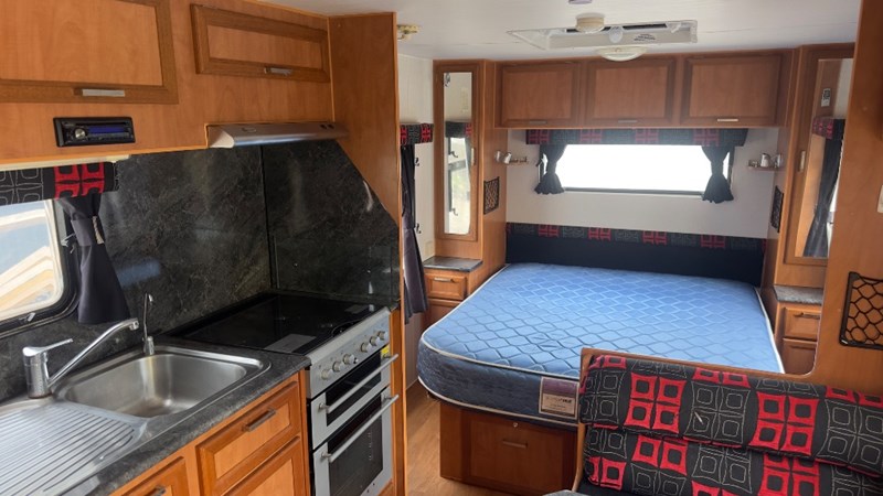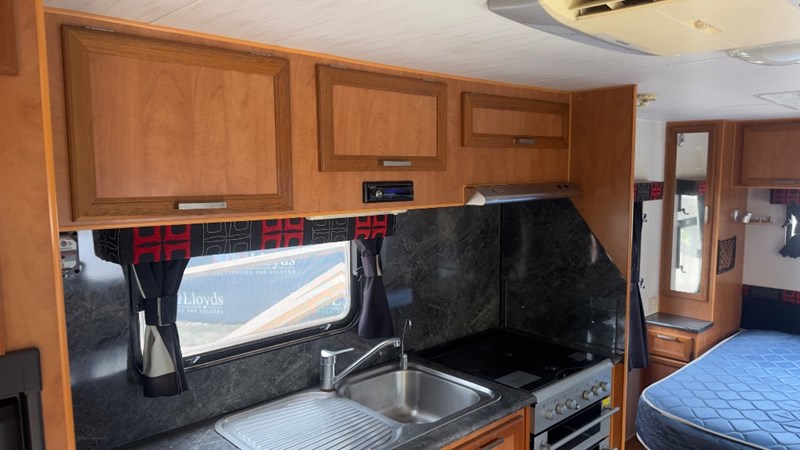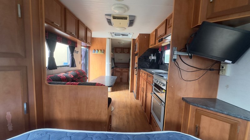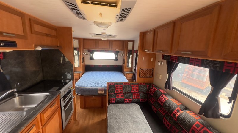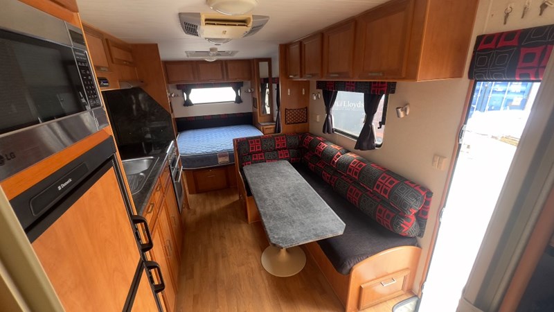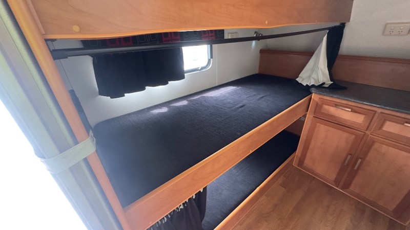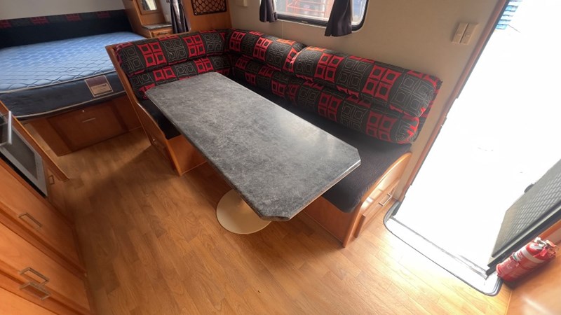 Interior Features, Lockable Entry With Flyscreen, Hybrid Timber Look Flooring, Dinning Table With L-Shaped Couch, Dometic Fridge/Freezer, LG Microwave, Single Stainless Sink, Counter Top, Oven/Grill, Hotplates With Rangehood, Pro Star 30 Solar Control, Enclosed Shower, Enclosed Toilet/Bathroom, 3 Person Bunk, 1 x Double Matress, Flat Screen T.V, Dometic Air System, Loads Of Storage Cabinets And Cupboards