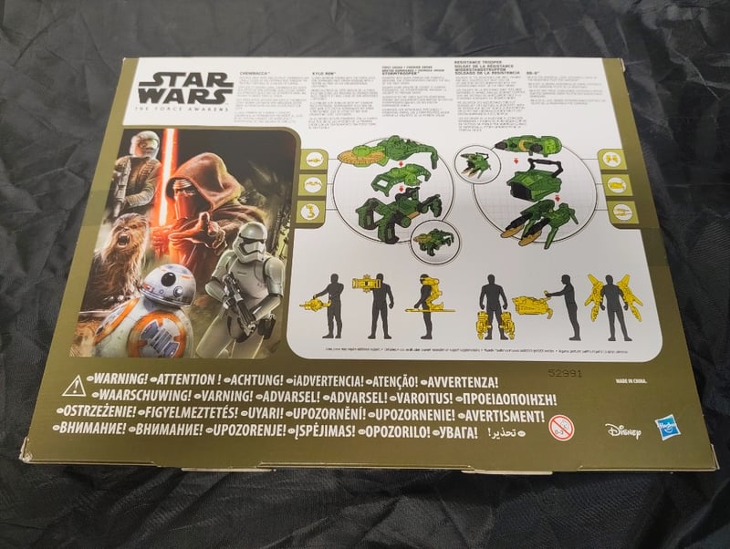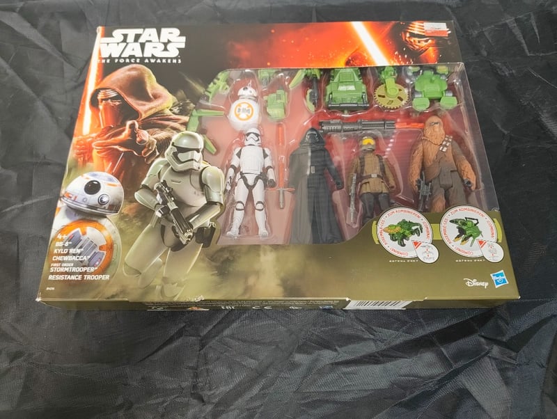 Hasbro Star Wars The Force Awakens Deluxe Multi-Figure Collection Featuring Bb-8, First Order Stormtrooper, First Order Flametrooper, Resistance Trooper, Kylo Ren, Chewbacca, And Additional Character Figures. Set Includes Two Buildable Vehicle Sets With Interconnecting Green Components And Action Accessories. Original Packaging With Multilingual Warning Text Intact. Complete With Instruction Sheets And Figure Identification Charts.