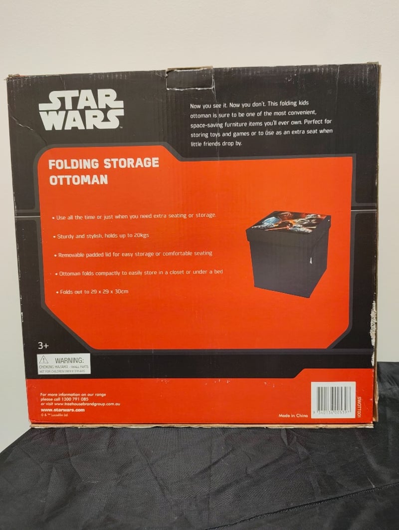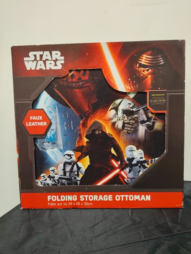 Star Wars Episode Vii Themed Folding Storage Ottoman In Faux Leather Construction. Features Character Artwork Including Kylo Ren And First Order Stormtroopers. Collapsible Design With Removable Padded Lid Suitable For Toy Storage Or Additional Seating. Capacity 20Kg. Dimensions When Unfolded 29 X 29 X 30Cm.
