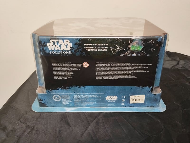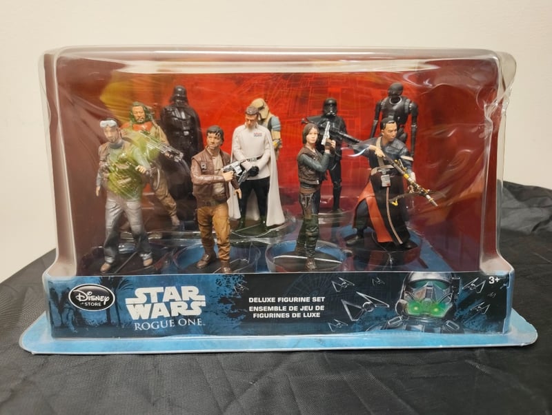 STAR WARS ROGUE ONE DELUXE FIGURINE SET - DISNEY STORE EXCLUSIVEDisney Store Exclusive Star Wars Rogue One Deluxe Figurine Set Comprising Nine Character Figures Displayed On A Themed Base With Red Backdrop. Original Packaging Intact With Clear Acrylic Display Case, Bilingual Labeling (English/French), And Safety Certifications. Figures Include Main Cast Characters In Detailed Costumes With Weapons And Accessories.Condition: Good - Refer To Images584522+234