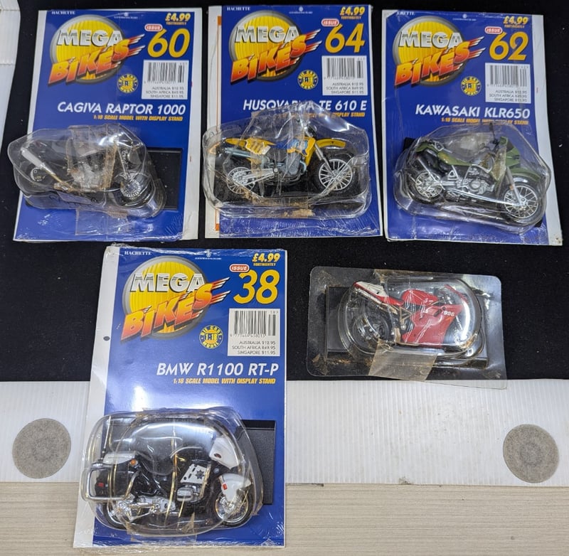 FIVE 1:18 SCALE MODEL MOTORBIKESIncludes: Cagiva Raptor 1000, Bmw R11 Rt-P, Husqvarna Te610 E, Kawasaki Klr650, Bmw R1100 Rt-P, Ducati 996Sps584809+57