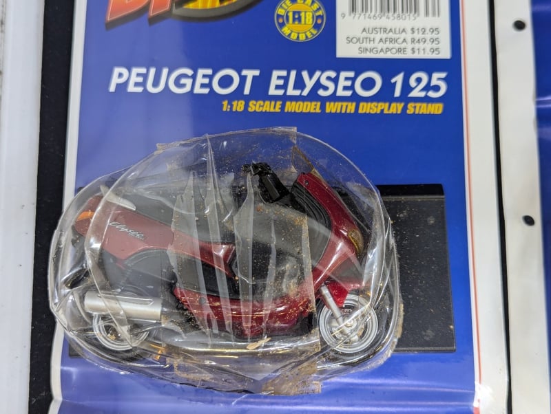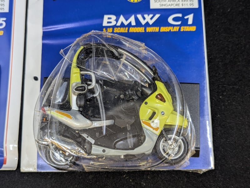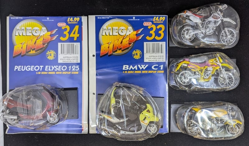 FIVE 1:18 SCALE MODEL MOTORBIKESIncludes: Peugeot Elyseo 125, Bmw C1, Honda Xr400R, Kawasaki Klx250Sr, Ducati Monster 900584809+59