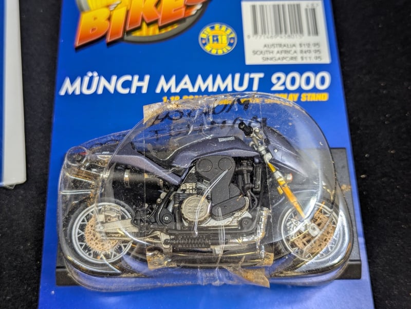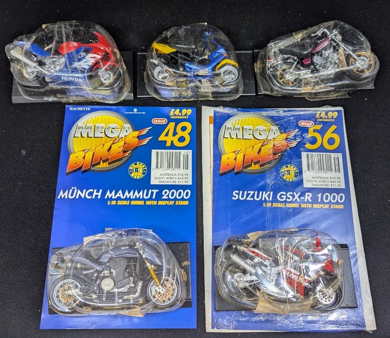 FIVE 1:18 SCALE MODEL MOTORBIKESIncludes: Munch Mammut 2000, Suzuki Gsx-R 1000, Honda Cbr600F, Peugeot Speedfight, Yamaha Xv1000 Virago584809+62