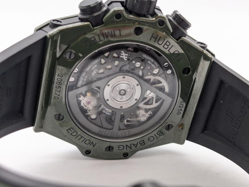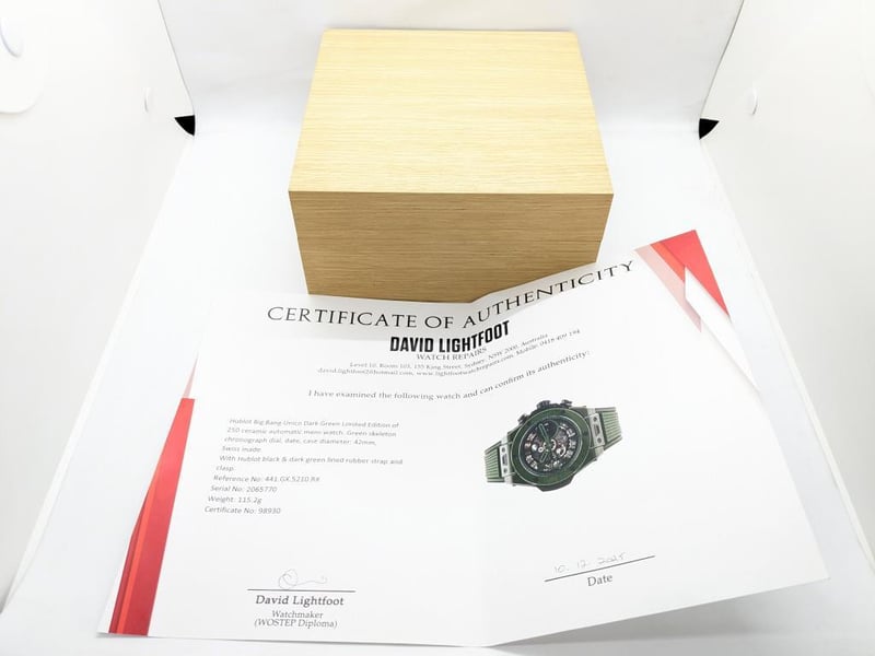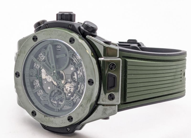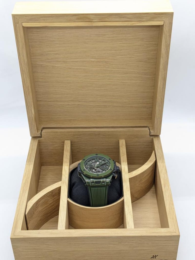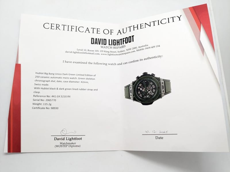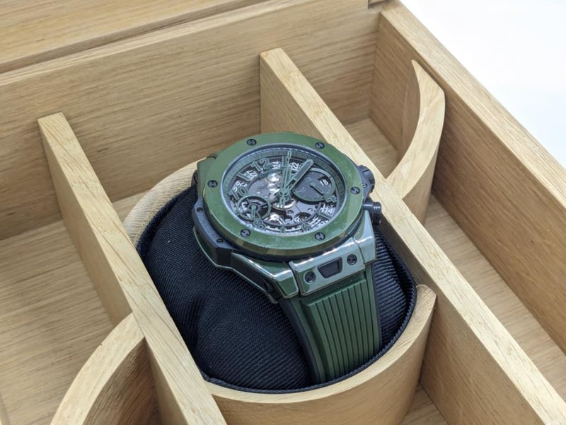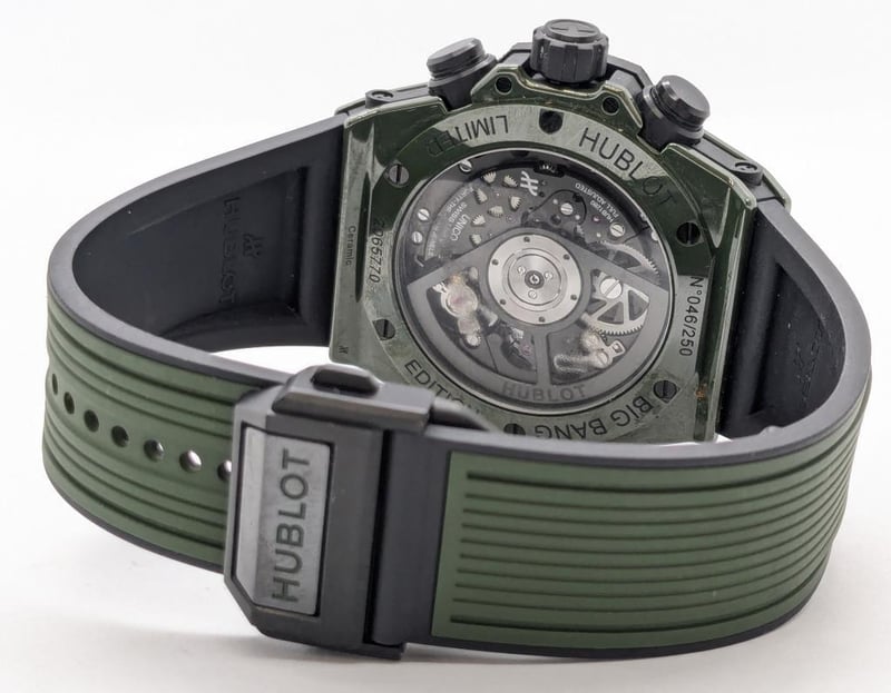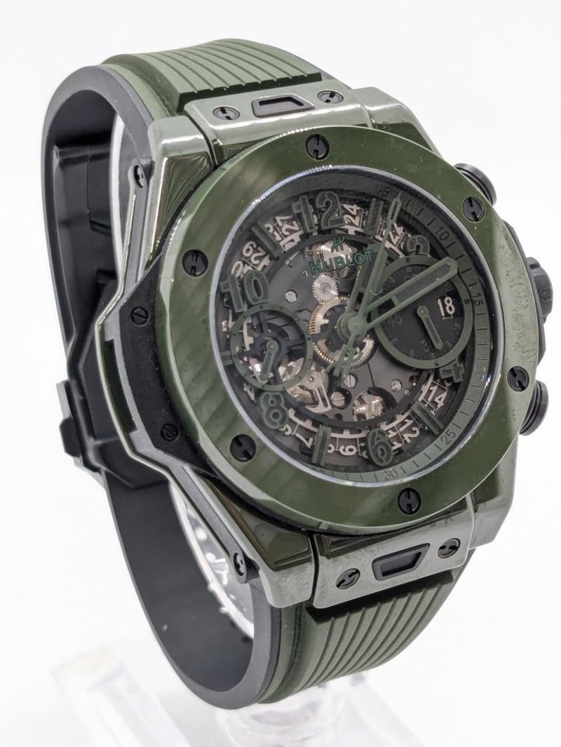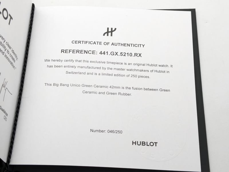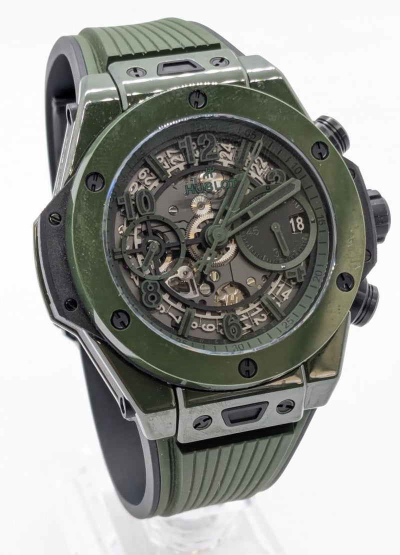 HUBLOT UNICO DARK GREEN CERAMIC 441.GX.5210.RX 2024 REFERENCE NO. 441.GX.5210.RXPRODUCTION YEAR: 2024DIAL: GREEN SKELTONCASE DESCRIPTION: POLISHED GREEN CERAMICCASE SIZE: 42MMBRACELET: BLACK AND GREEN STRUCTURED LINED RUBBERMOVEMENT: HUB1280 UNICO MANUFACTURE SELF-WINDING CHRONOGRAPH FLYBACK MOVEMENT WITH COLUMN WHEELBOX: INCLUDED PAPERS: INCLUDED Condition: Excellent condition - Refer To ImagesAdditional Information: Power Reserve: Approx. 72 HoursACACIA RIDGE584485+1
