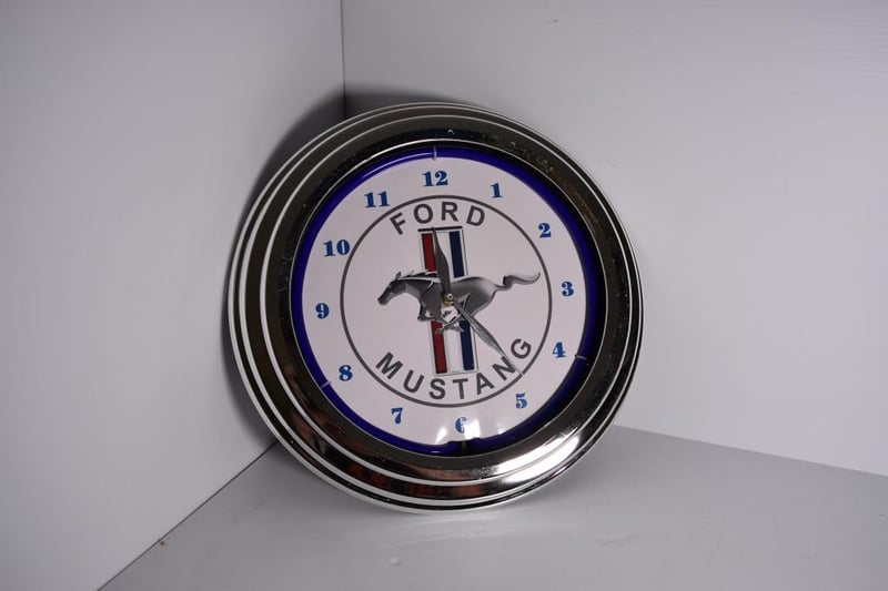 Vintage Chrome look " Mustang" Neon Wall clock, Battery powered and wall plug, No glass, in orignal packaging