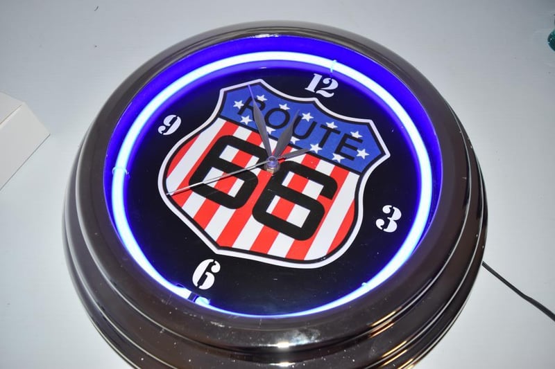 Vintage Chrome look "Route 66" Neon Wall clock, Battery powered and wall plug, No glass, in orignal packaging