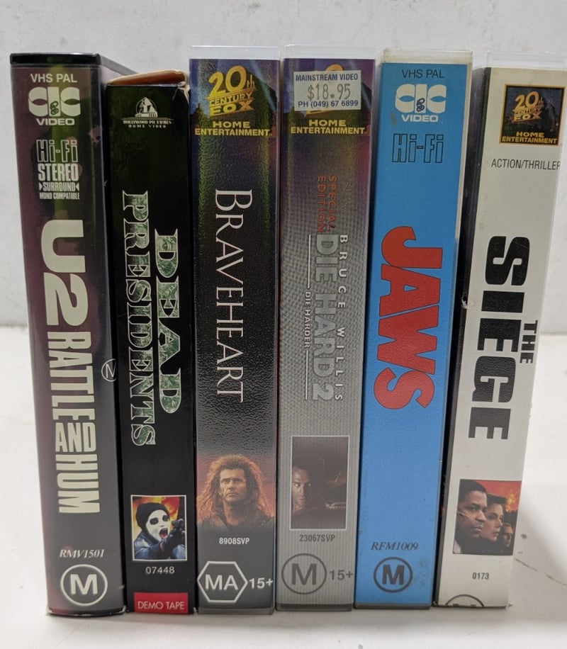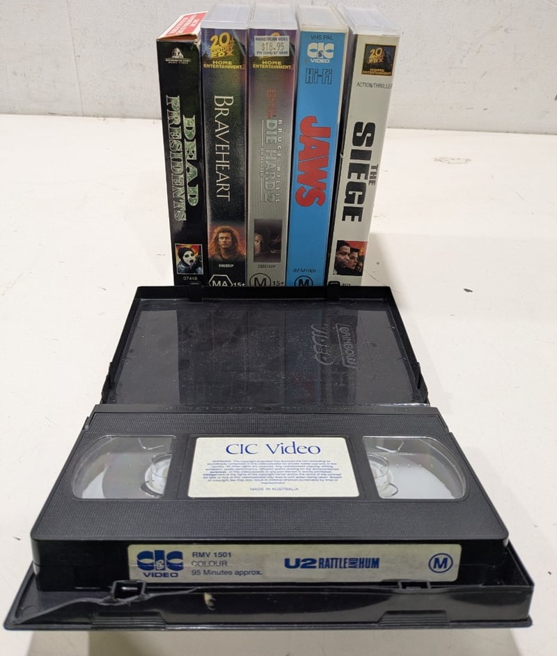 VHS, Action, movies include U2 rattle and hum,dead presidents,Braveheart, die hard 2, jaws, the siege