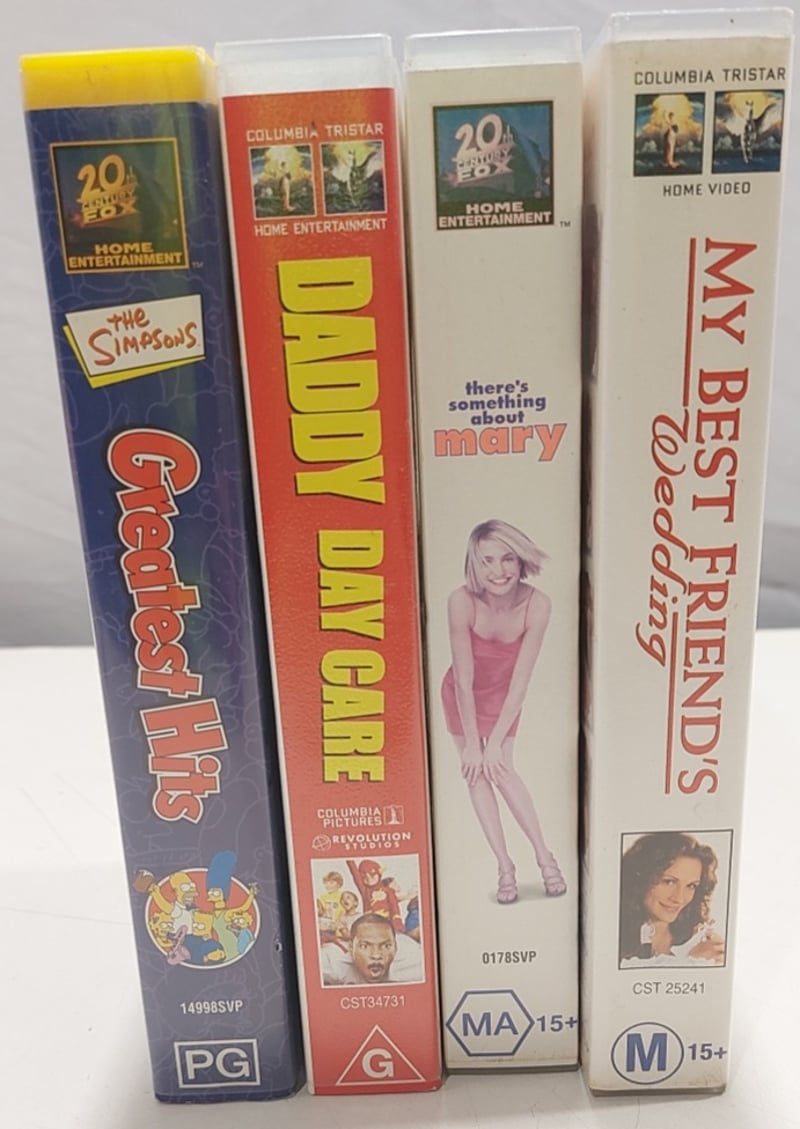 VHS tapes, comedy includes My best friends wedding, Greater hits, Day day care, there is something about mary