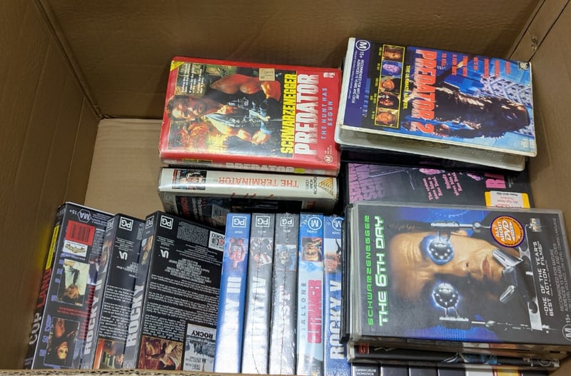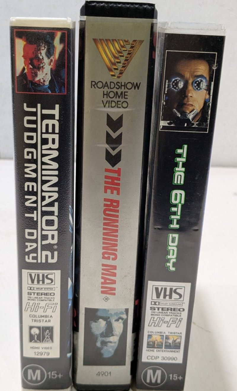 VHS, sci-fi, movies include teminator 2, the running man, the 6th and more