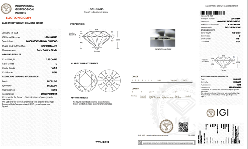Please note that while all lab grown diamonds listed include certification, the report number or identification may vary upon arrival. This is due to standard manufacturing and batching processes. However, the diamond’s specifications — including carat, color, cut, and clarity — will match or may even exceed those advertised.