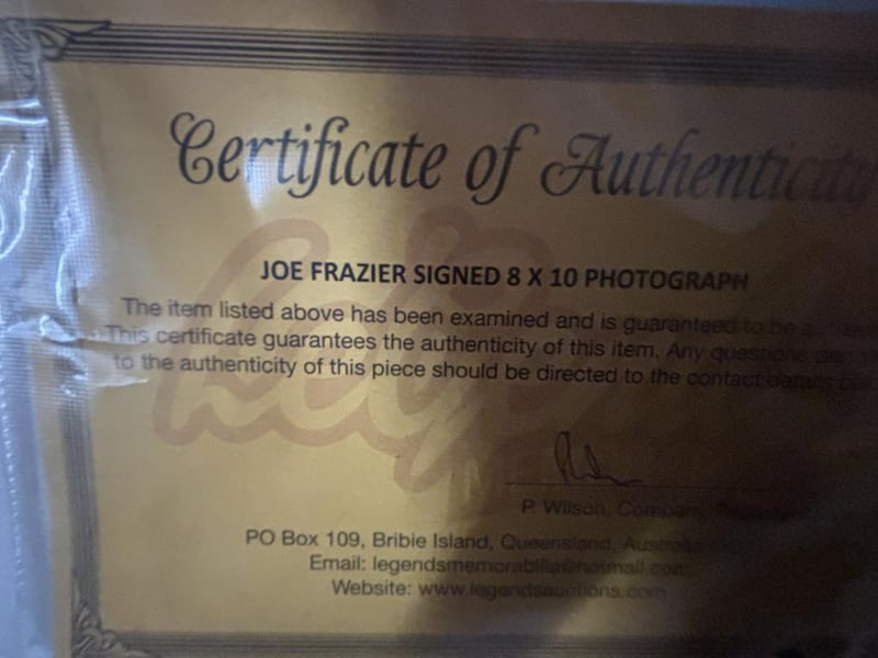 ALI, FOREMAN & FRAZIER SIGNED X 3Muhammad Ali (D 2016), George Foreman (D 2025) And Joe Frazier (D 2012) Individually Signed 8 X 10 Photographs. The Photos Are Custom Framed With A Gold Plaque. Measuring 860 X 400, This Is Ready To Hang. The Item Is Accompanied By Three Certificates Of Authenticity.+1