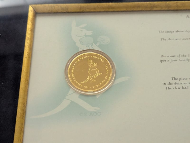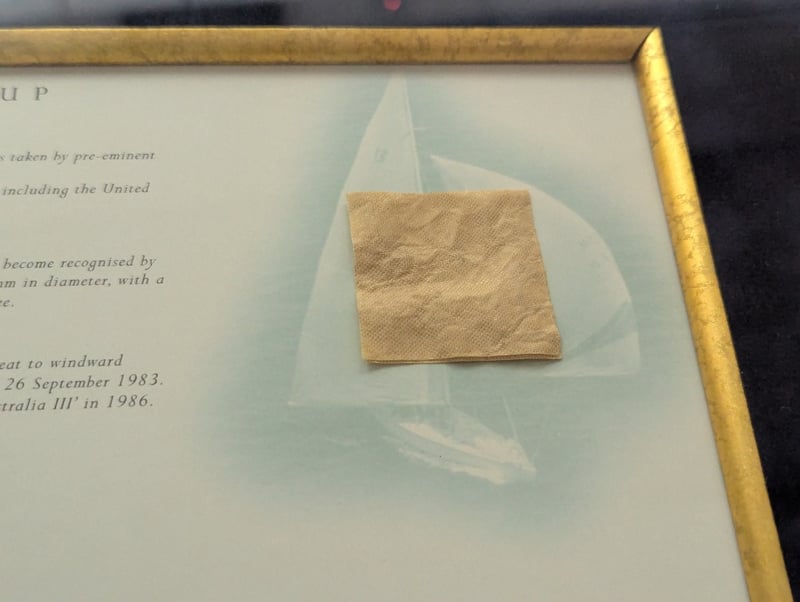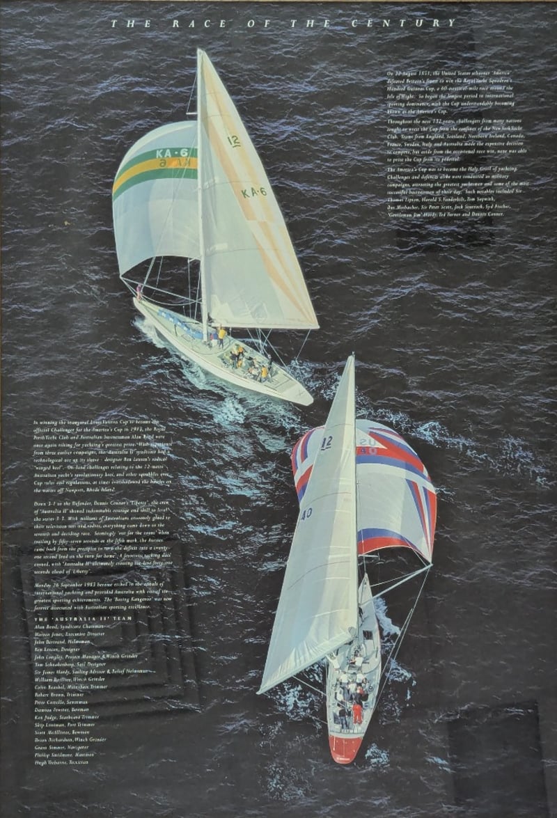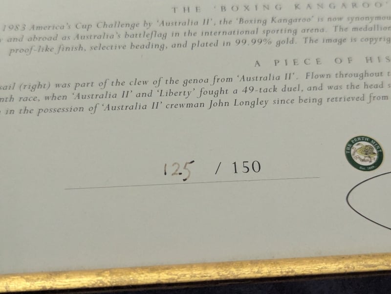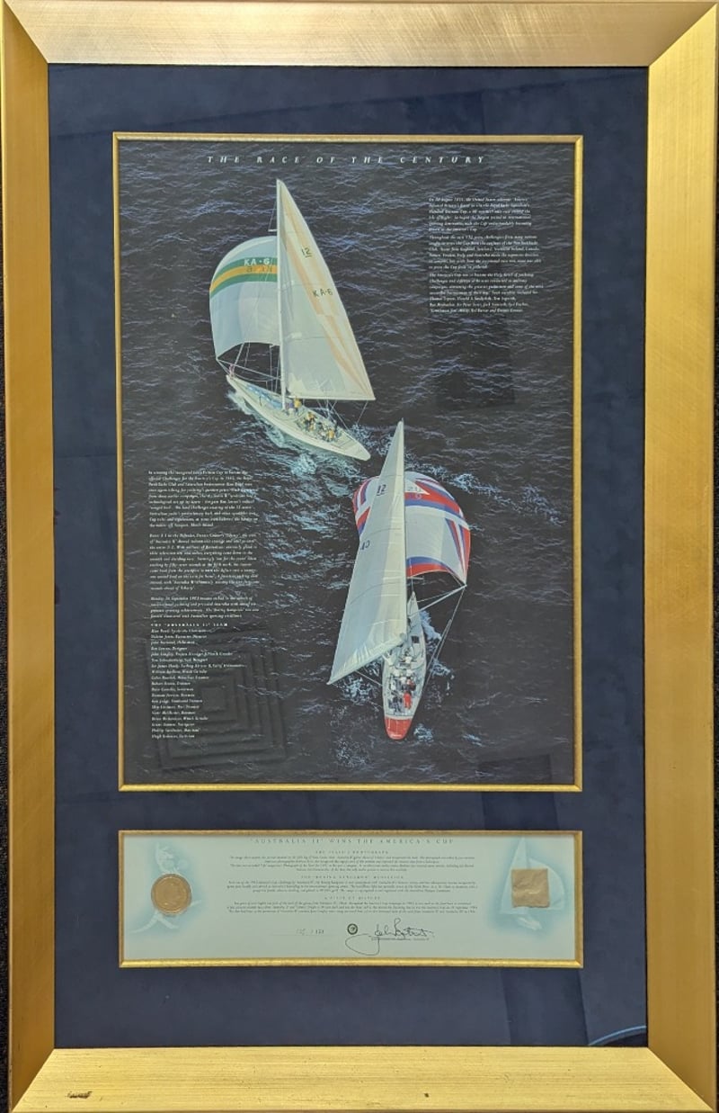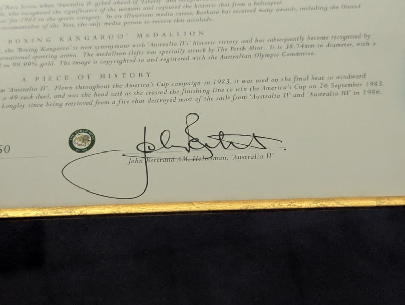LIMITED EDITION 1983 AMERICA'S CUP "THE RACE OF CENTURIES" FRAME WITH SIGNATURE Item Size: Height: 115cm, Width: 75cm, Depth: 6cm Includes Australia Ii Team List, John Bertrand Signature, "Boxing Kangaroo" Medallion, And A Piece Of The Australia Ii Sail Edition: 125/150 Condition: Good - Refer To Images 584940+6