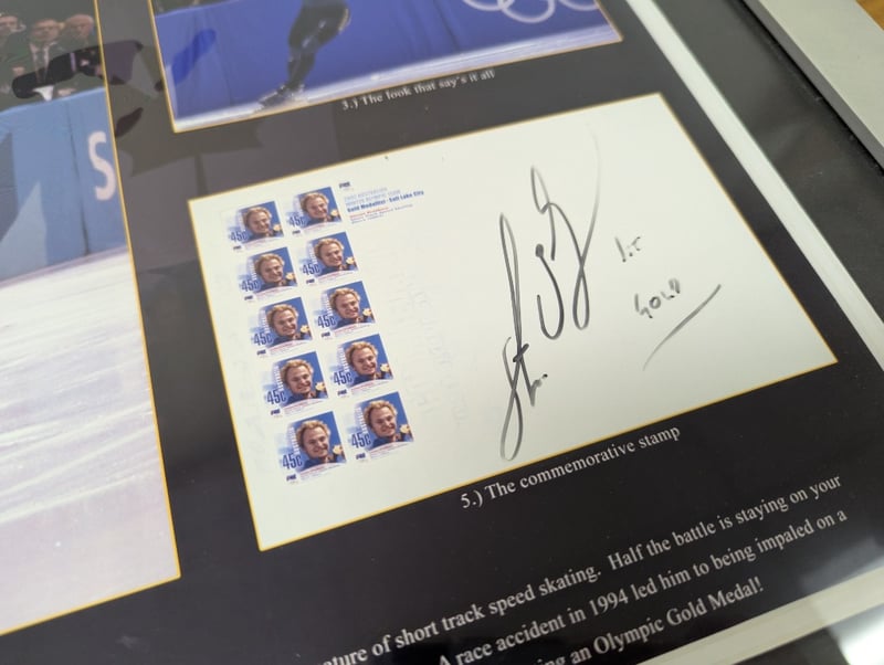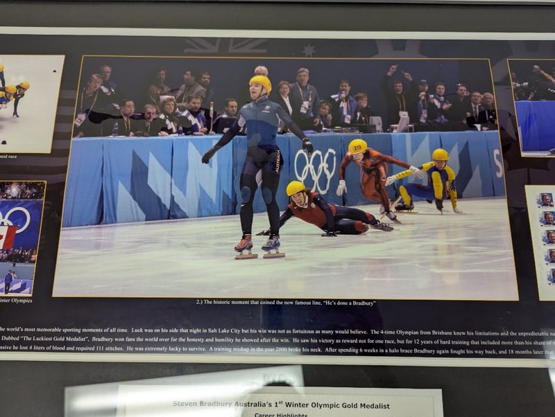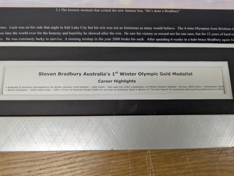 2002 AUSTRALIAN WINTER OLYMPIC GOLD MEDALIST STEVEN BRADBURY FRAMED AND SIGNED Item Size: Height: 38cm, Width: 88cm, Depth: 4cm Includes Signature From Steven Bradbury, Commemorative Stamp, And Highlights. Condition: Good - Refer To Images 584940+7
