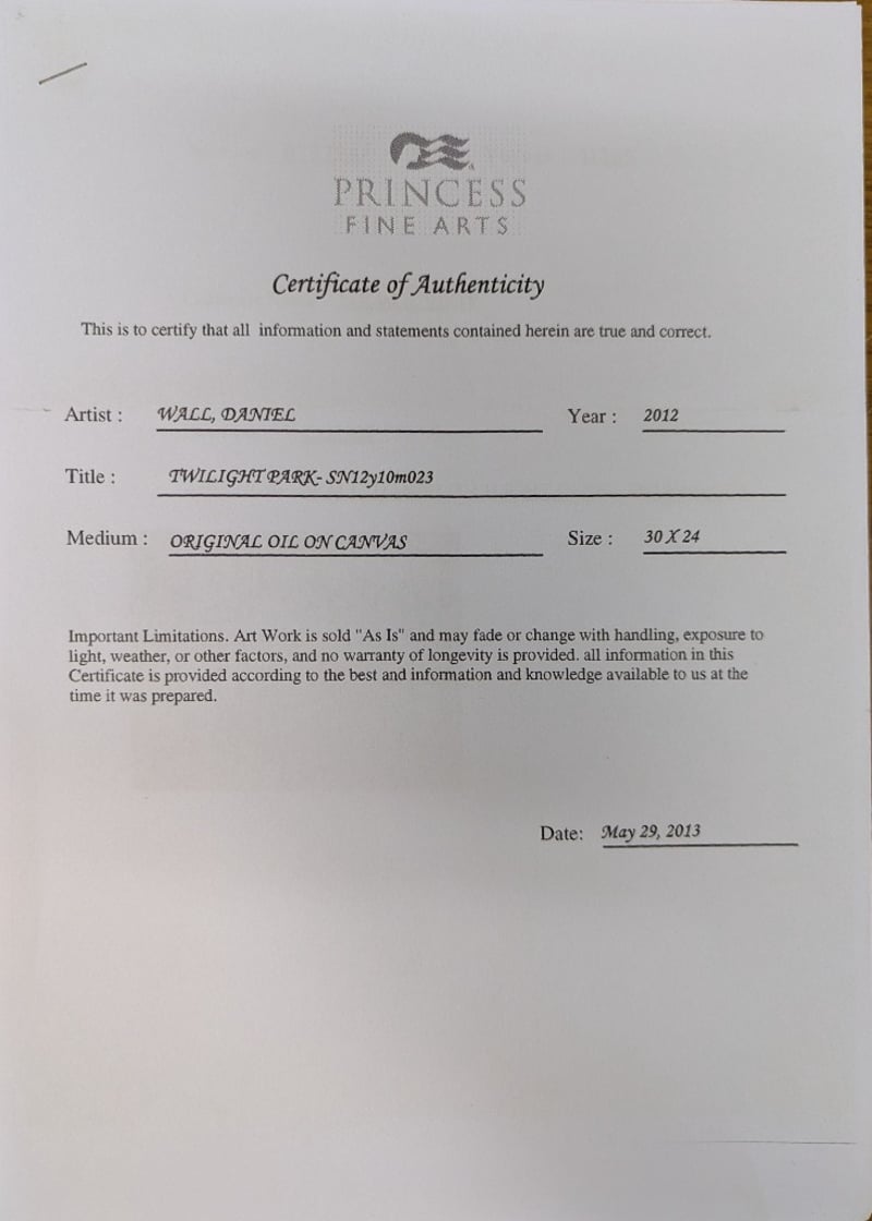 DANIEL WALL ( 1965 - )Original Oil On CanvasTitle: 'Twilight Park'Image Size: 60cm x 75cmFrame Size: 91cm x 106cmSignature Details: Signed Lower LeftAccompanied By A Certificate Of AuthenticityCondition: Good - Refer To Images584933+26