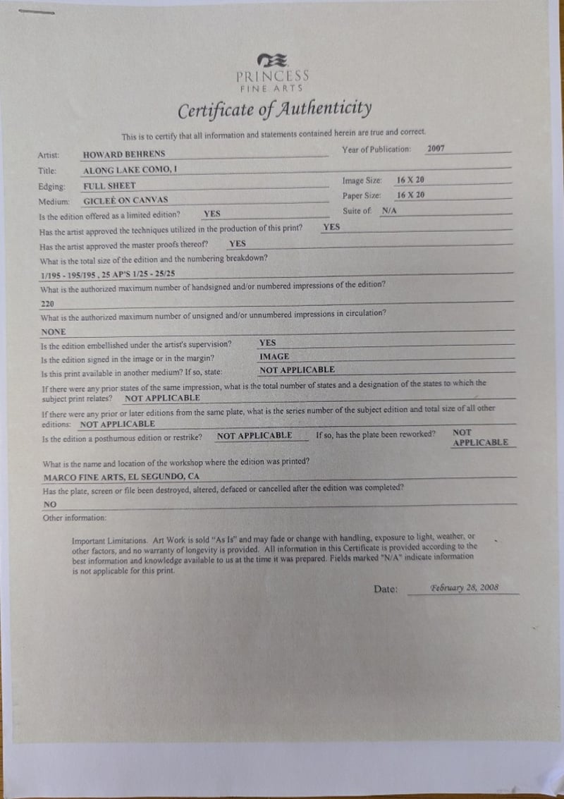HOWARD BEHRENS ( 1933 - 2014 )Gicleé On CanvasTitle: Along Lake ComoImage Size: 42cm x 50cmFrame Size: 72cm x 81cmAccompanied By A Certificate Of AuthenticityCondition: Good - Refer To Images584933+8
