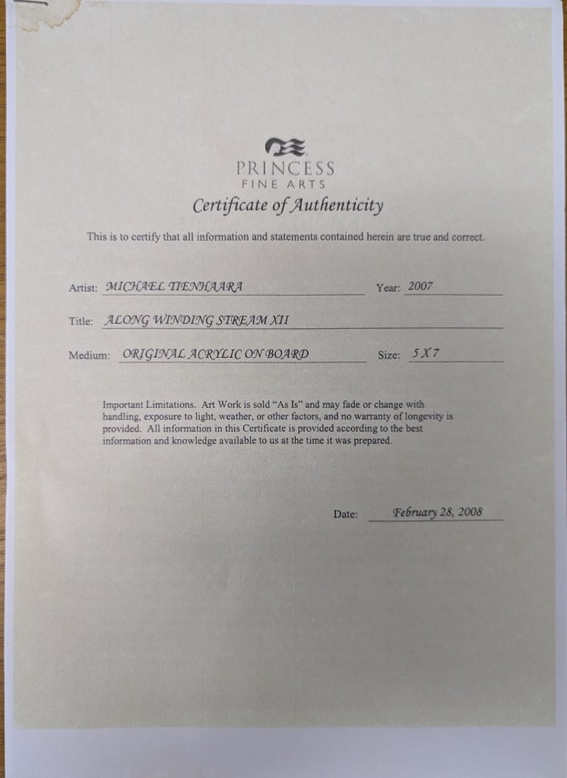 MICHAEL TIENHAARA ( 1945 - )Original Acrylic On BoardTitle: 'Along Winding Stream Xii'Image Size: 13cm x 18cmFrame Size: 54cm x 59cmSignature Details: Signed Lower RightAccompanied By A Certificate Of AuthenticityCondition: Good - Refer To Images584933+9