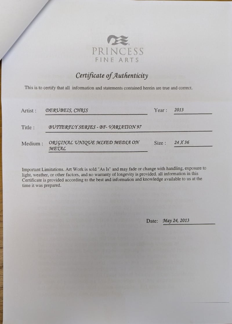 CHRIS DERUBEIS ( 1978 - )Original Mixed Media On MetalTitle: 'Butterfly Series'Image Size: 90cm x 59cmFrame Size: 85cm x 117cmSignature Details: Signed Lower RightAccompanied By A Certificate Of AuthenticityCondition: Good - Refer To Images584933+33
