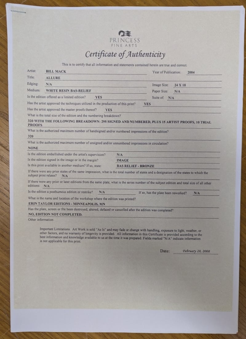 BILL MACK ( 1944 - )Original White Resin ArtworkTitle: 'Allure'Image Size: 60cm x 45cmFrame Size: 92cm x 76cmSignature Details: Signed Top RightAccompanied By A Certificate Of AuthenticityCondition: Good - Refer To Images584933+20