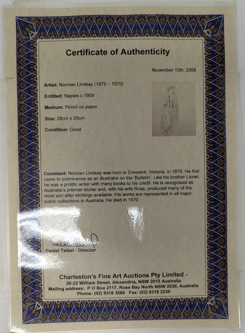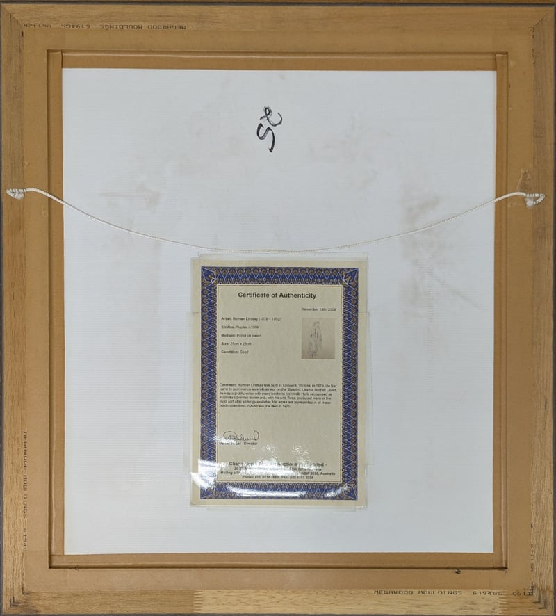 NORMAN LINDSAY ( 1879 - 1970 )Original Pencil On PaperTitle: UnknownImage Size: 26cm x 19cmFrame Size: 74cm x 67cmSignature Details: Signed Lower CentreAccompanied By A Certificate Of AuthenticityCondition: Good - Refer To ImagesNote: Minor Wear On Frame584933+21