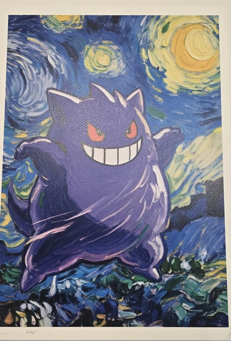 DEATH NYC Title: Gengar Starry Night Archival Print On Textured Fine Art Watercolor Paper, Hand-Signed By Artist And Numbered /100, 30 X 21 Cm Edition: 100 Size: 45Cm X 32Cm Paper: 300 Gsm Fine Art Paper Signed By Death Nyc (Made In Nyc) Comes With Certificate Of Authenticity Card And Gold Seal Sticker Death Chooses To Keep Her Identity Anonymous, She Believes That It Gives Her More Freedom To Continue To Work On The Street. She Began Painting On Walls And Floors Of Popular Shops In Soho And Chelsea Area Of New York City. She Gets The Name Death From The Abbreviation Of “Don’T Easily Abandon The Hope”. Death Tries To Ridicule The Mainstream Media By Making Fun Of Popular Images. 585013+7