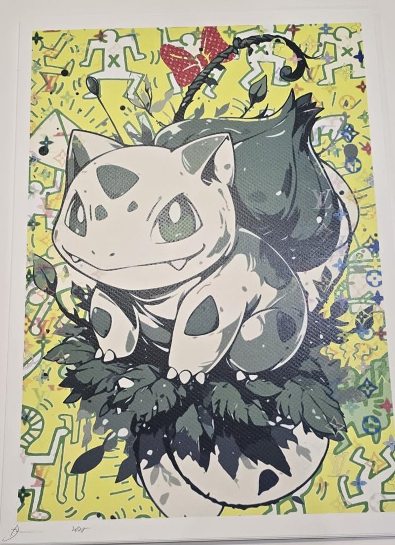 DEATH NYC Title: Bulbasaur Archival Print On Textured Fine Art Watercolor Paper, Hand-Signed By Artist And Numbered /100, 30 X 21 Cm Edition: 100 Size: 45Cm X 32Cm Paper: 300 Gsm Fine Art Paper Signed By Death Nyc (Made In Nyc) Comes With Certificate Of Authenticity Card And Gold Seal Sticker Death Chooses To Keep Her Identity Anonymous, She Believes That It Gives Her More Freedom To Continue To Work On The Street. She Began Painting On Walls And Floors Of Popular Shops In Soho And Chelsea Area Of New York City. She Gets The Name Death From The Abbreviation Of “Don’T Easily Abandon The Hope”. Death Tries To Ridicule The Mainstream Media By Making Fun Of Popular Images. 585013+24