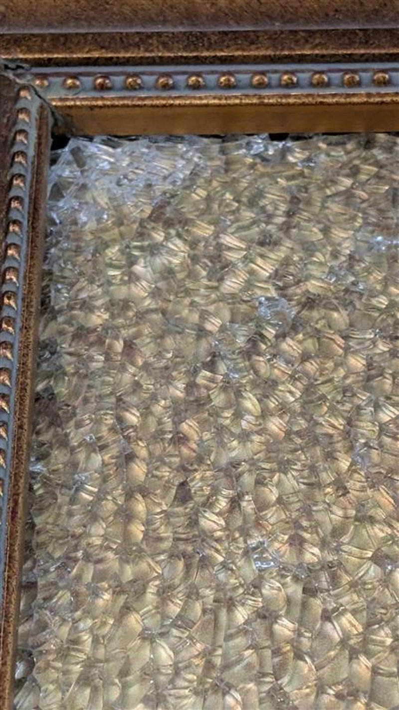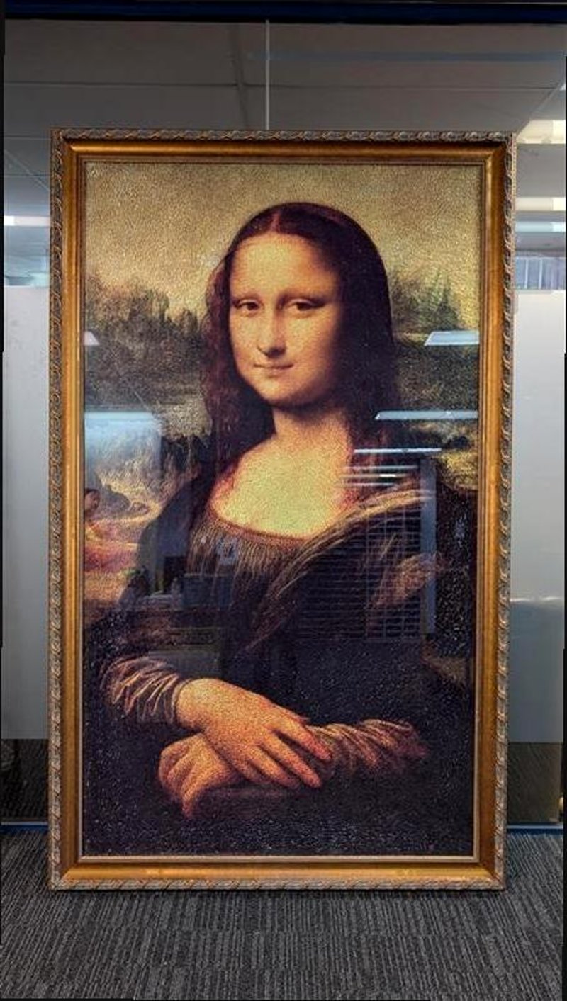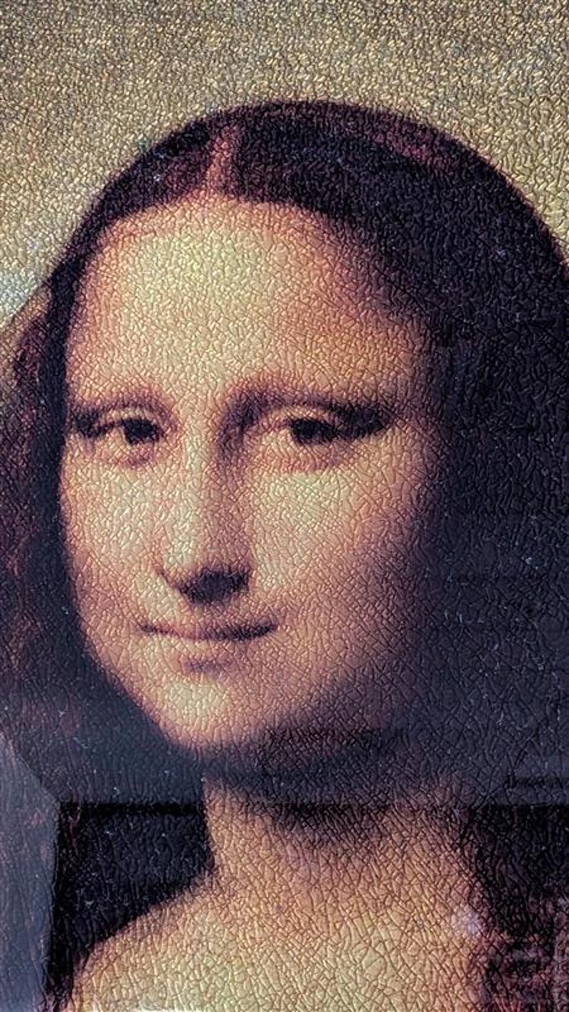 Mona Lisa Print Displayed Beneath Three Layers Of Glass, With The Middle Layer Intentionally Cracked To Create A Vintage, Aged Effect. Surrounded By A Beautiful Timber Frame.