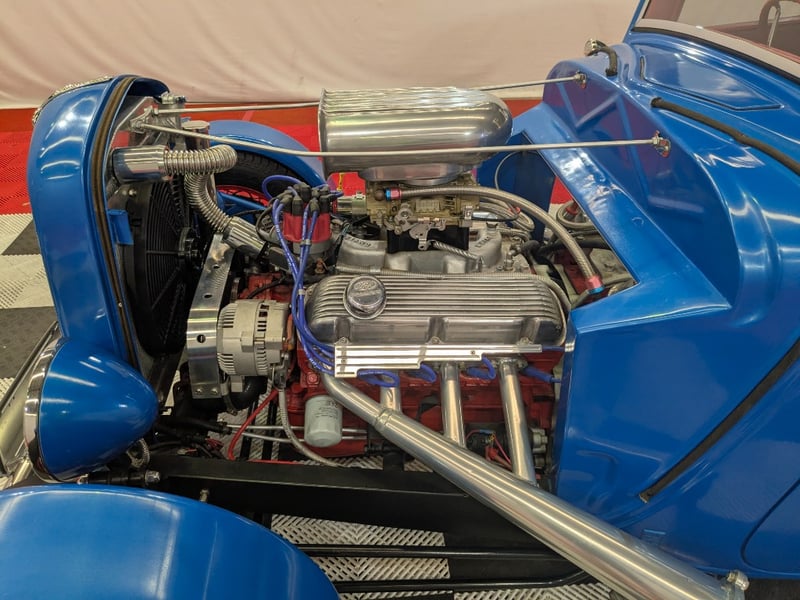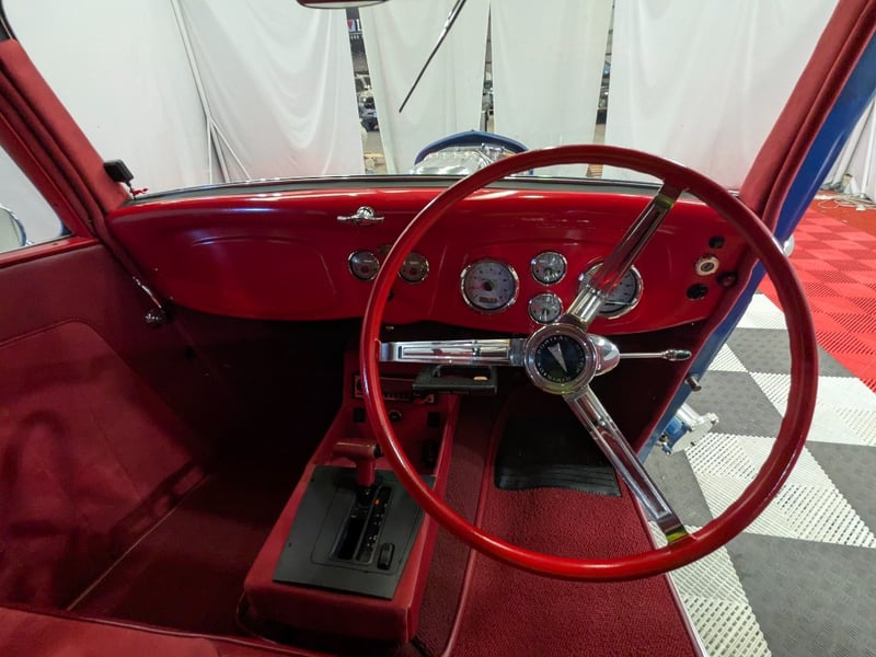 1934 Ford 40 two‑door coupe finished in Blue. Rear‑wheel drive configuration powered by a 5.0‑litre V8 petrol engine paired with a 4‑speed automatic transmission. Odometer indicating 2,960 kilometres. Seating for one occupant.