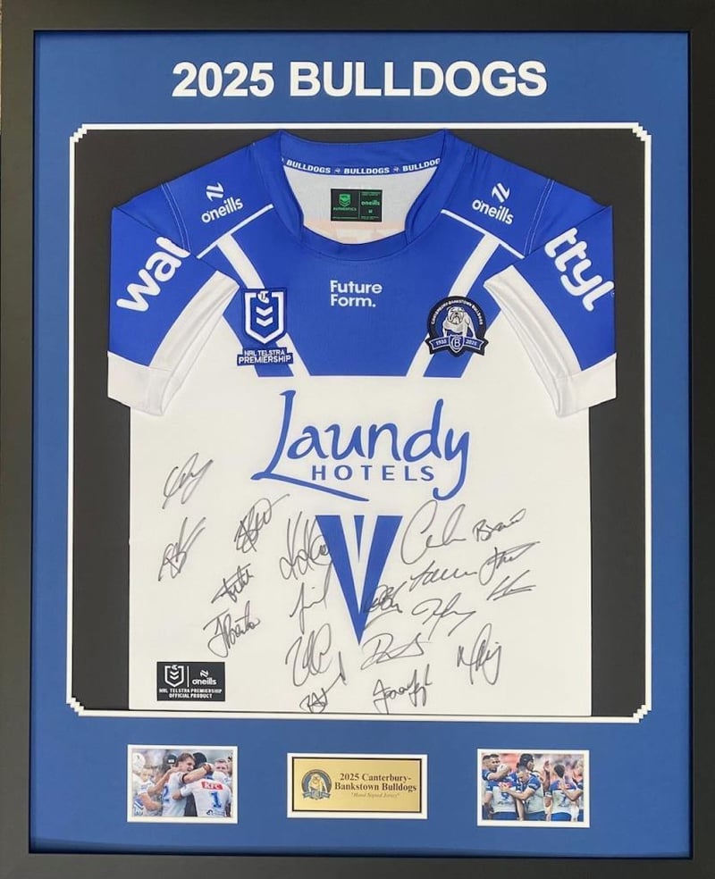 2025 CANTERBAURY-BANKSTOWN BULLDOGS PERSONALLY SIGNED JERSEY Framed Using Double Mats, 2 Unsigned Photographs And A Plaque. Hand Signed By 19 Members Of The 2025 Canterbury-Bankstown Bulldogs Squad Using A Black MarkerAccompanied By A Certificate Of AuthenticitySize: 109 X 2 X 89Condition: Good - Refer To Images488295+4