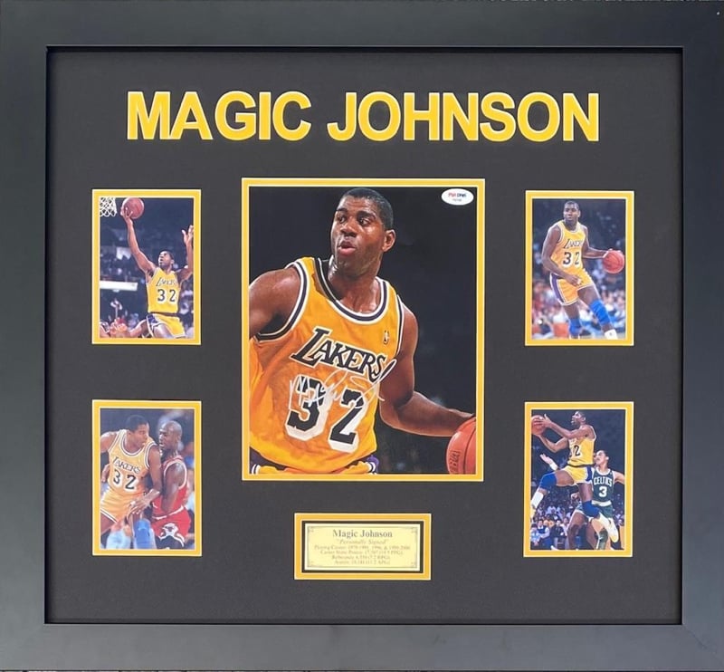 MAGIC JOHNSON PERSOANLLY SIGNED 10" X 8" PHOTOGRAPH Framed Using Double Mats, 4 Unsigned Photographs And A Plaque. Hand Signed By Magic Johnson Using A Silver MarkerAccompanied By A Certificate Of Authenticity From Psa/DnaSize: 63 X 2 X 57Condition: Good - Refer To Images488295+26