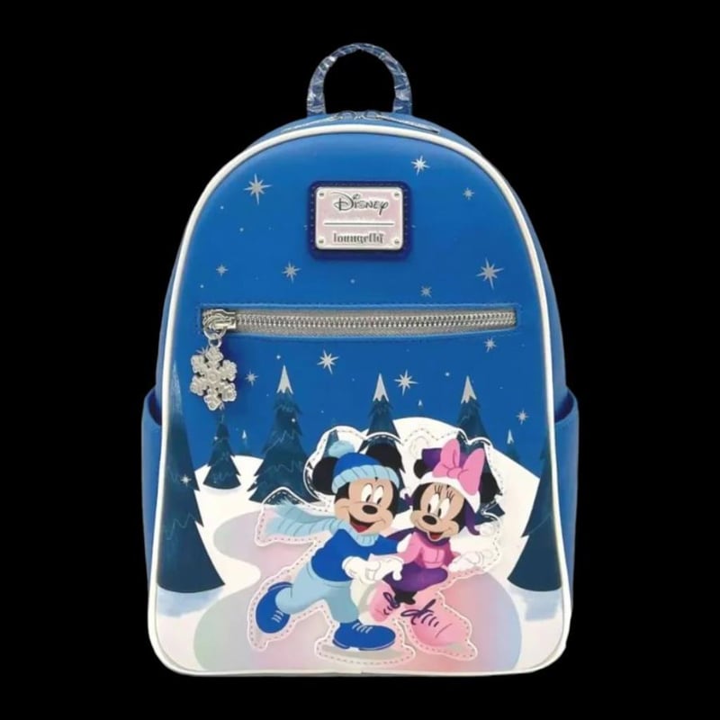 LOUNGEFLY DISNEY - MICKEY & MINNIE WINTER SCENE US EXCLUSIVE MINI BACKPACKThere’S Nothing Better Than A Snow Day!Serving As The Mascot Couple For Disney For Nearly A Century, The Lovable Mickey And Minnie Mouse Have Brought Generation After Generation Countless Amounts Of Joy And Laughter.This Adorable Accessory Sets The Scene For Winter Fun! On The Front, Mickey And Minnie Skate Together On Iridescent Ice. Silver Foil Details Add A Whimsical Touch While A Snowflake Shaped Enamel Zipper Charm Completes The Scene. In Addition To A Roomy Main Storage Compartment, This Mini Backpack Features A Top Carry Handle, Adjustable Shoulder Straps, Two Side Pockets And A Front Zipped Compartment.Product Features:Enamel Zipper CharmFaux LeatherAdjustable Shoulder StrapsAppliquePrinted DetailsCondition: Good - Refer To Images488292+33498