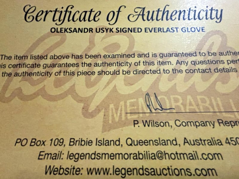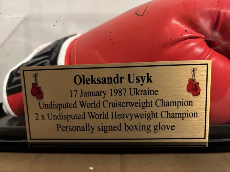 Oleksandr Usyk Personally Signed Everlast Boxing Glove. The Ukraine Is The Current Undisputed World Heavyweight Champion Who Is Undefeated. Usyk Is A Former Undisputed World Cruiserweight Champion And Olympic Gold Medalist. Usyk Has Beaten To Date Boxers Fury (Twice), Joshua (Twice), Chisora And Dubois. He Is A Future Hall Of Famer. The Glove Is 12 Oz. The Glove Is Presented In An Acrylic Display Case (330 X 200 X 200) With A Statstics Plaque. The Item Is Accompanied By A Certificate Of Authenticity.