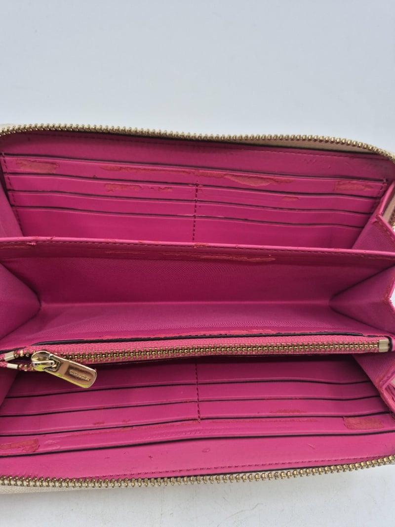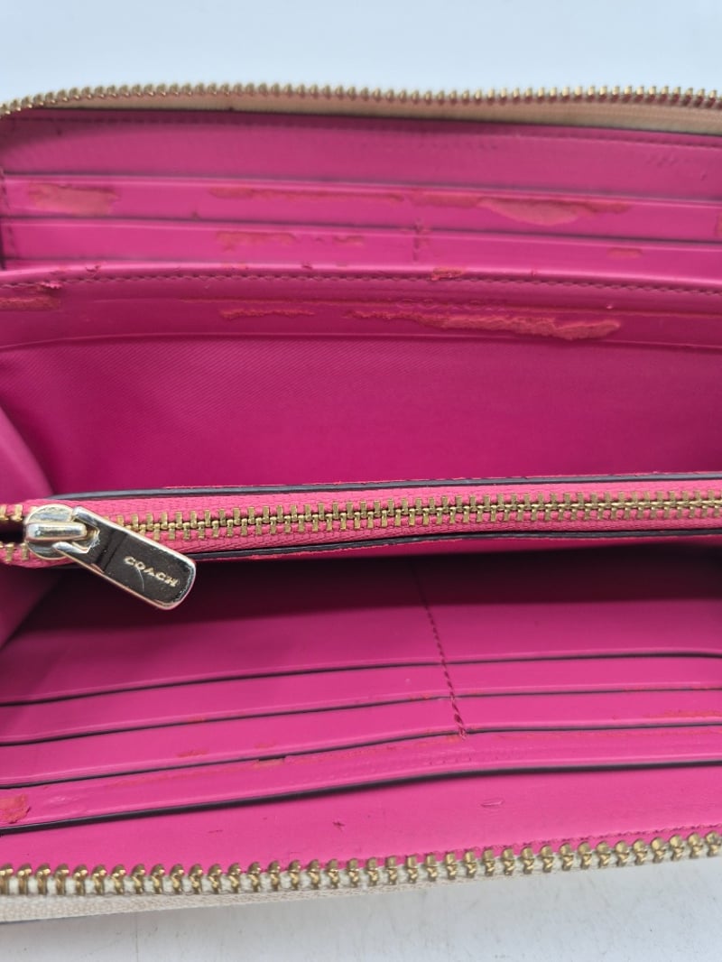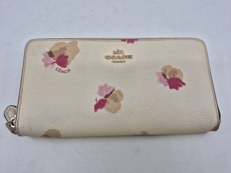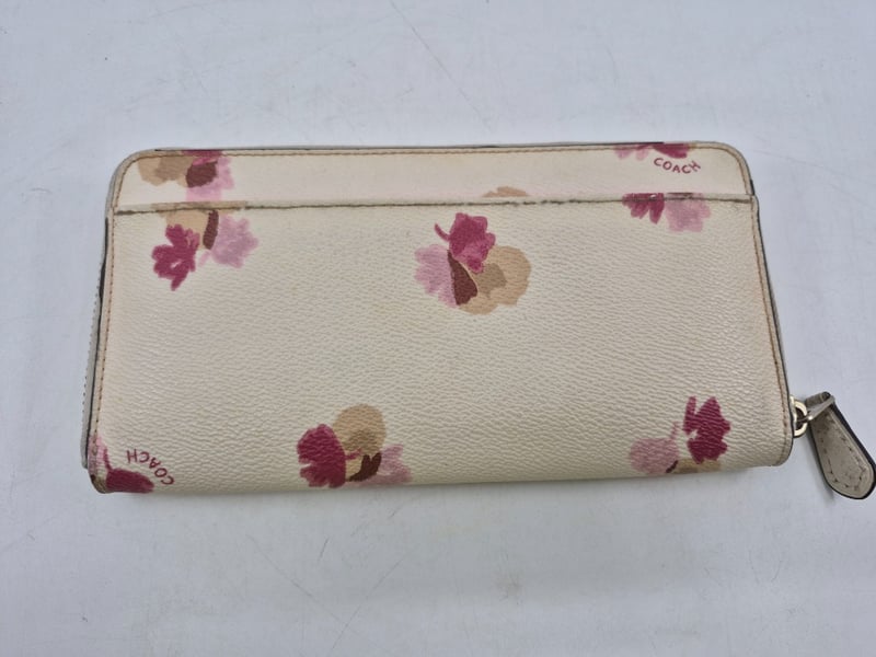 COACH FLORAL PRINT ZIP-AROUND WALLET, CREAM WITH PINK/BURGUNDY BLOOMS Item Size: Height: 10cm, Width: 2cm, Depth: 2cm, Weight: 0.25Kg Authentic Coach Wallet Condition: Good - Refer To Images 8C 586284+2