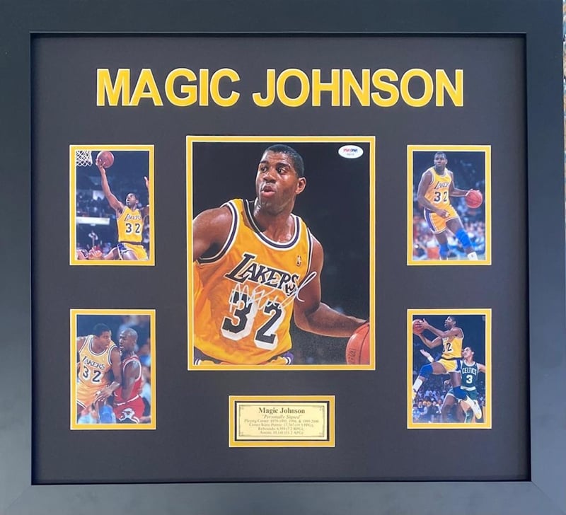 MAGIC JOHNSON PERSOANLLY SIGNED 10" X 8" PHOTOGRAPH (PSA/DNA COA)Framed Using Double Mats, 4 Unsigned Photographs And A Plaque. Hand Signed By Magic Johnson Using A Silver MarkerAccompanied By A Certificate Of Authenticity From Psa/DnaCondition: Good - Refer To Images488527+5
