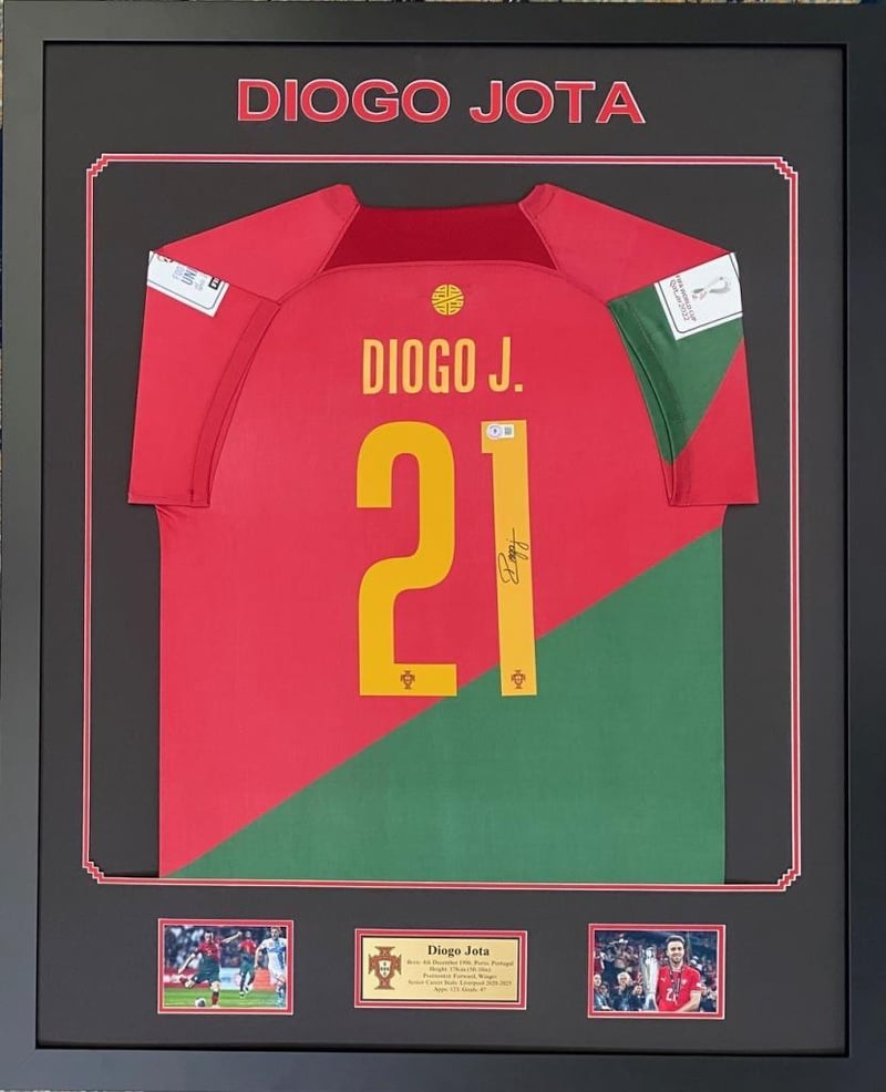 DIOGO JOTA PERSONALLY SIGNED PORTUGUESE JERSEY Framed Using Double Mats, 2 Unsigned Photographs And A Plaque. Hand Signed By Diogo Jota Using A Black MarkerAccompanied By A Certificate Of Authenticity From Beckett Condition: Good - Refer To Images488527+14