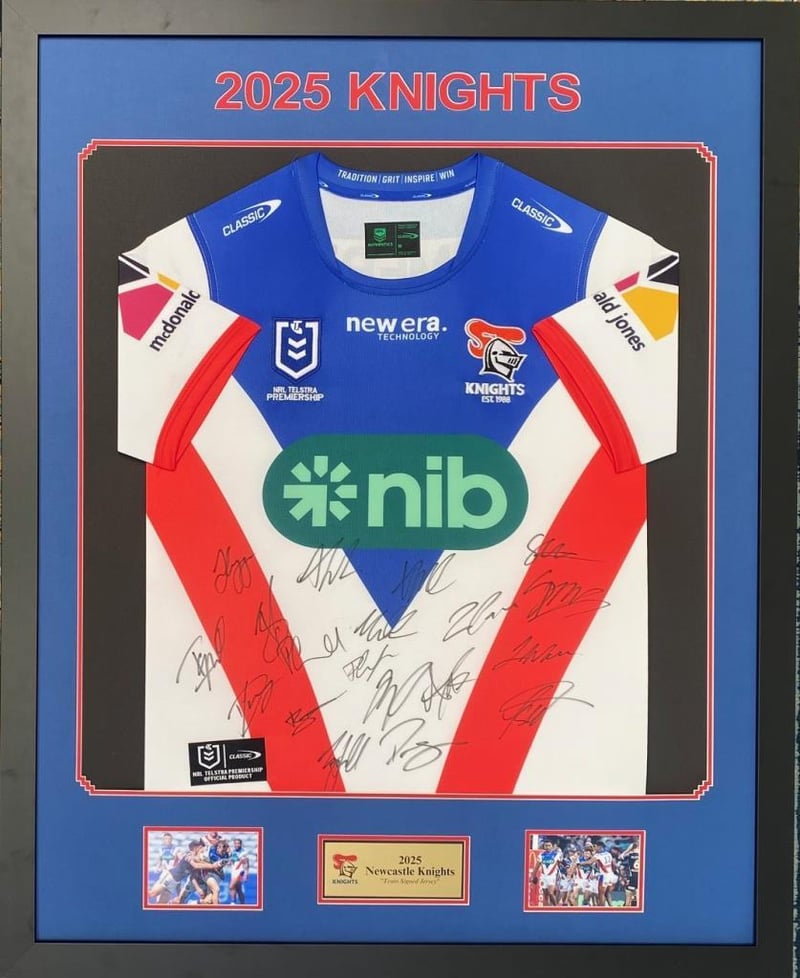 2025 NEWCASTLE KNIGHTS PERSONALLY SIGNED JERSEY Framed Using Double Mats, 2 Unsigned Photographs And A Plaque. Hand Signed By 19 Members Of The 2025 Newcastle Knights Squad Using A Black MarkerAccompanied By A Certificate Of AuthenticityCondition: Good - Refer To Images488527+24