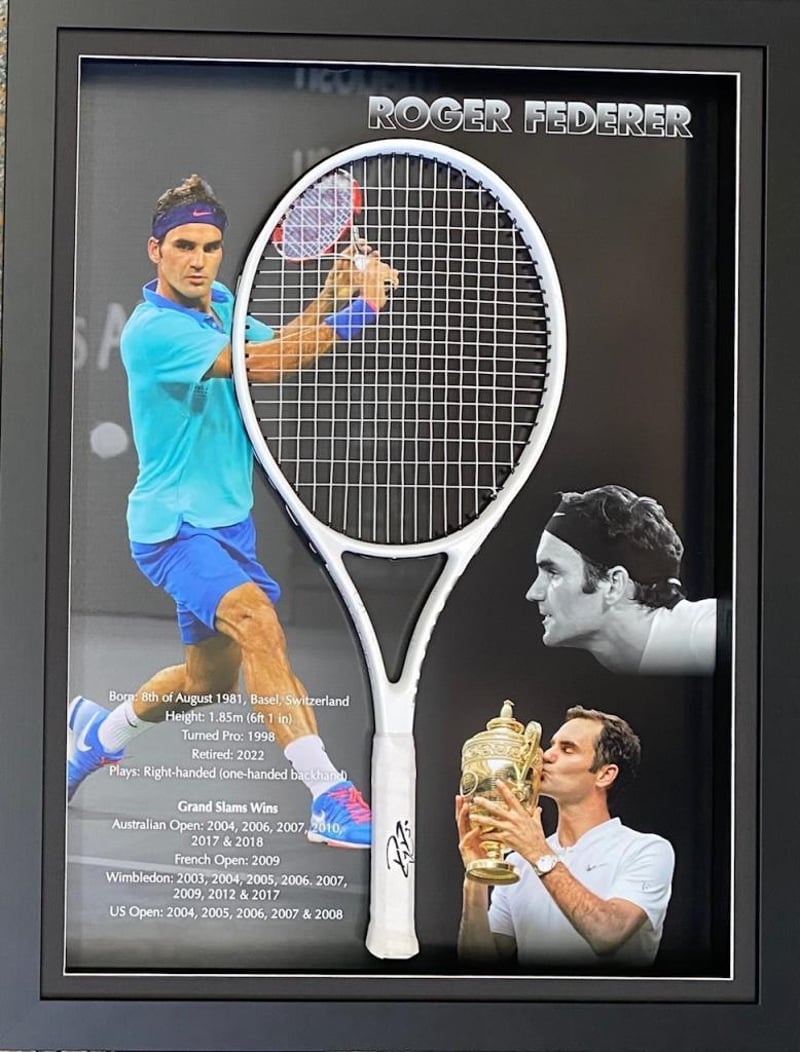 ROGER FEDERER PERSONALLY SIGNED TENNIS RACKETFramed Using A Sigle Mat, A Backdrop And A Black Frame Hand Signed By Roger Federer Using A Silver MarkerAccompanied By A Certificate Of AuthenticityCondition: Good - Refer To Images488527+26