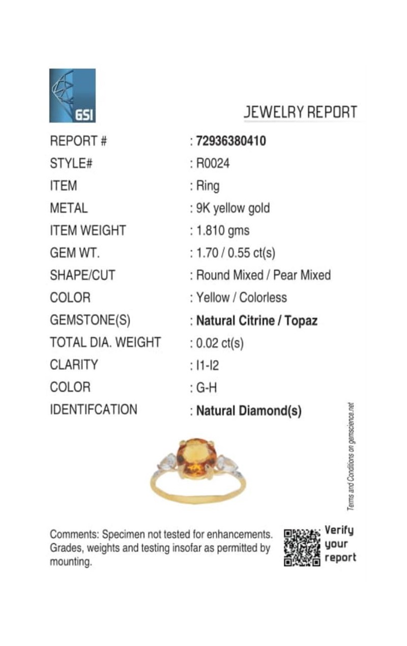 9CT YELLOW GOLD NATURAL CITRINE & DIAMOND RING Weight Of The Item: 1.81 GFineness Of Metal(S): Yellow Gold 9KtThe Ring Consists Of (1) Round Brilliant Natural Citrine & (2) Round Brilliant Cut White Topaz. Surrounding The Main Stones Are Round Brilliant Cut Natural Diamonds.Ring Size: Us 7Identification: Natural Citrine / Natural White TopazColor: Yellow / WhiteShape: Round Brilliant Cut / Pear Faceted CutNo. Of Stone: 3Dimension: 8 Mm X 8 Mm X 4.8 MmWeight: 1.7 Carats / 0.55 CaratsCut: Very GoodIdentification: Natural DiamondShape: Round Brilliant CutWeight: 0.02 CtsCertificates Are Provided By Gemological Science International (Gsi), An Independent Third-Party Gemological Laboratory Based In The Usa And Recognised Among The Top 10 Gem Labs Globally Condition: Good - Refer Images 0160841+120