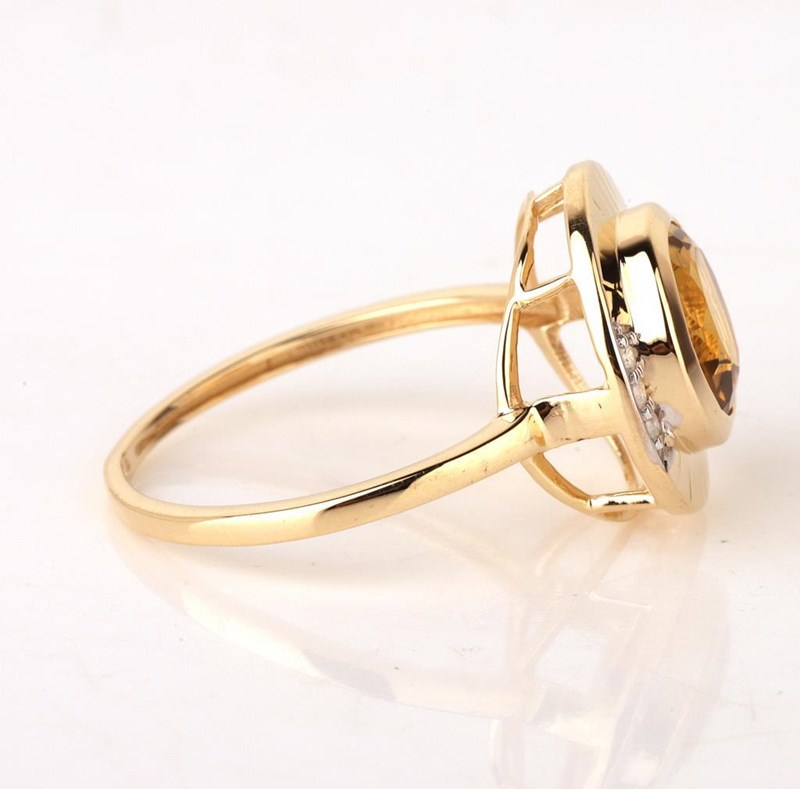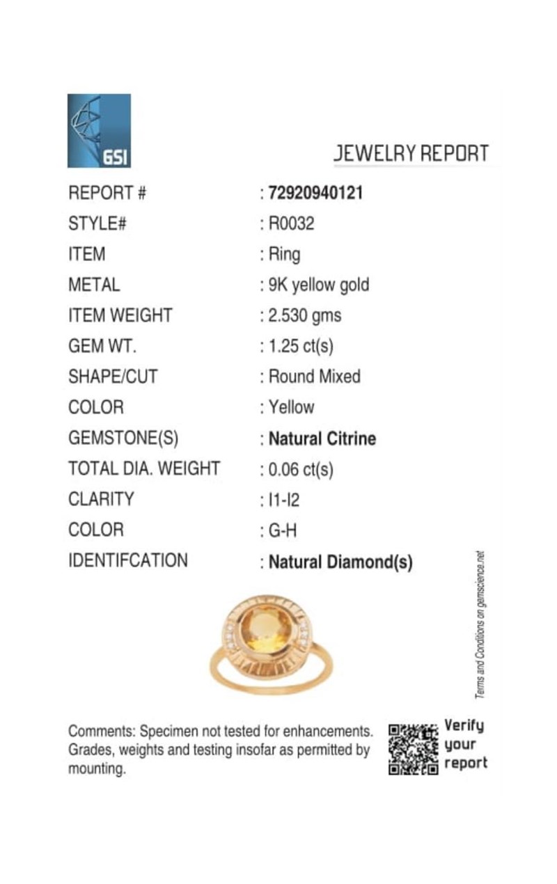 9CT YELLOW GOLD NATURAL CITRINE & DIAMOND RING Weight Of The Item: 2.53 GFineness Of Metal(S): Yellow Gold 9KtThe Ring Consists Of (1) Round Brilliant Natural Citrine. Surrounding The Main Stones Are Round Brilliant Cut Natural Diamonds.Ring Size: Us 7Identification: Natural CitrineColor: YellowShape: Round Brilliant CutNo. Of Stone: 1Dimension: 8 Mm X 8 Mm X 4.8 MmWeight: 1.25 CaratsCut: Very GoodIdentification: Natural DiamondShape: Round Brilliant CutWeight: 0.06 CtsCertificates Are Provided By Gemological Science International (Gsi), An Independent Third-Party Gemological Laboratory Based In The Usa And Recognised Among The Top 10 Gem Labs Globally Condition: Good - Refer Images 0160841+164