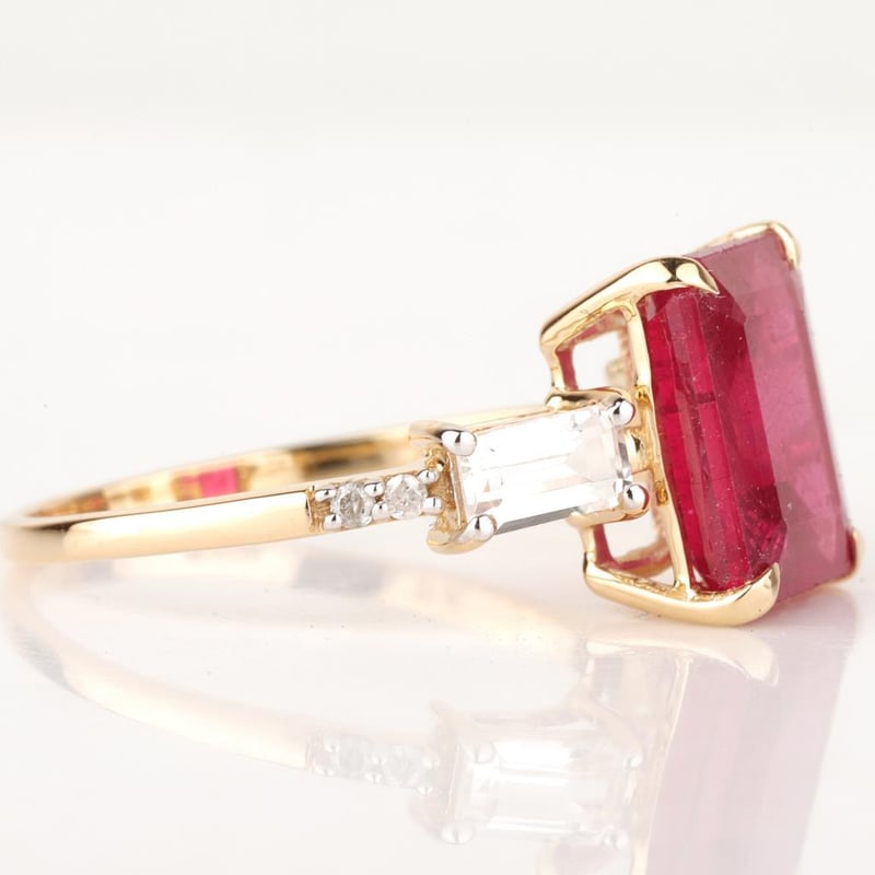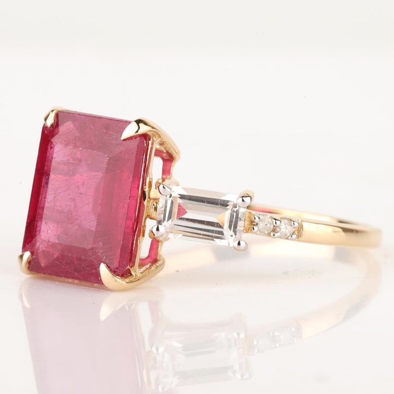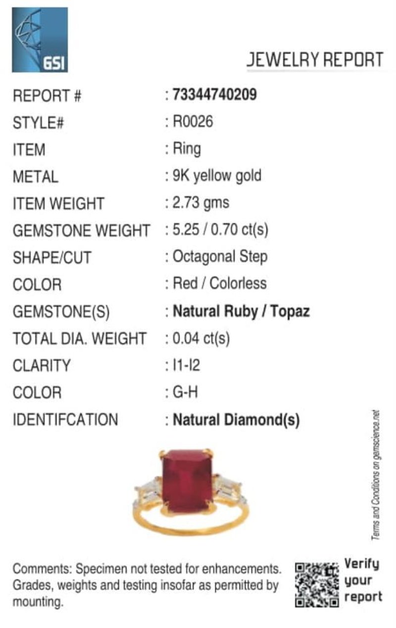 9CT YELLOW GOLD NATURAL RUBY / NATURAL WHITE TOPAZ & DIAMOND RING Weight Of The Item: 2.73 GFineness Of Metal(S): Yellow Gold 9KtThe Ring Consists Of (1) Octagon Brilliant Natural Ruby & (2) Baguette Step Cut White Topaz. Surrounding The Main Stones Are Round Brilliant Cut Natural Diamonds.Antique StyleIdentification: Natural Ruby / Natural White TopazColor: Red / WhiteShape: Octagon Brilliant Cut / Baguette Faceted CutNo. Of Stone: 3Dimension: 10 Mm X 8 Mm X 6 MmWeight: 5.25 Carats / 0.7 CaratsCut: Very GoodIdentification: Natural DiamondShape: Round Brilliant CutWeight: 0.04 CtsCut: Excellent. Certificates Are Provided By Gemological Science International (Gsi), An Independent Third-Party Gemological Laboratory Based In The Usa And Recognised Among The Top 10 Gem Labs Globally Condition: Good - Refer Images 0488266+64