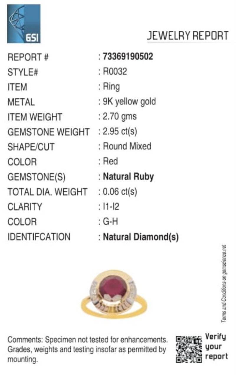 9CT YELLOW GOLD NATURAL RUBY & DIAMOND RING Weight Of The Item: 2.7 GFineness Of Metal(S): Yellow Gold 9KtThe Ring Consists Of (1) Round Brilliant Natural Ruby. Surrounding The Main Stones Are Round Brilliant Cut Natural Diamonds.Antique StyleIdentification: Natural RubyColor: RedShape: Round Brilliant CutNo. Of Stone: 1Dimension: 8 Mm X 8 Mm X 4.8 MmWeight: 2.95 CaratsCut: Very GoodIdentification: Natural DiamondShape: Round Brilliant CutWeight: 0.06 CtsCut: Excellent. Certificates Are Provided By Gemological Science International (Gsi), An Independent Third-Party Gemological Laboratory Based In The Usa And Recognised Among The Top 10 Gem Labs Globally Condition: Good - Refer Images 0488266+76