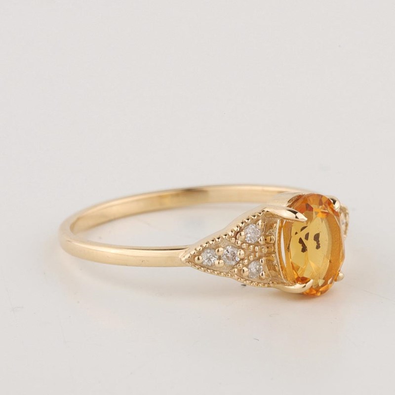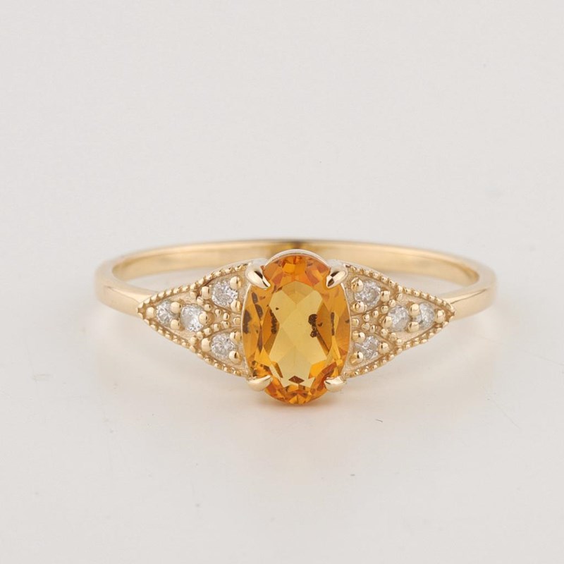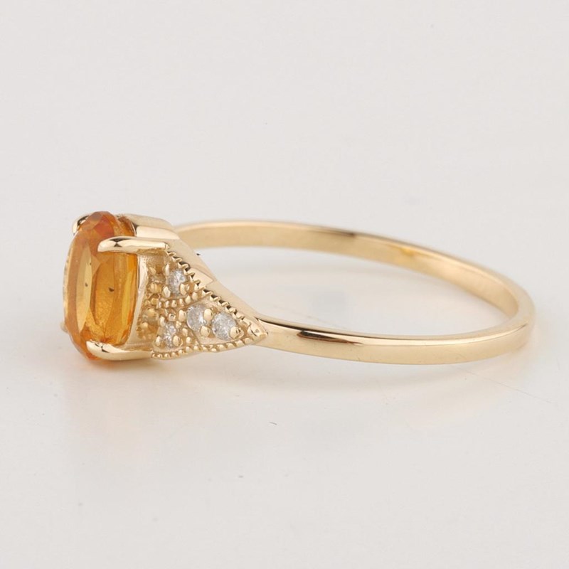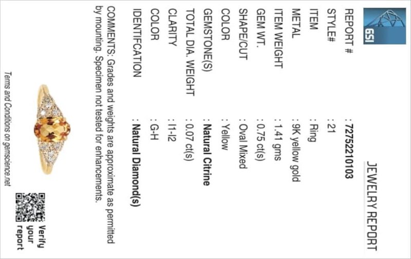9CT YELLOW GOLD NATURAL CITRINE & DIAMOND RING Weight Of The Item: 1.41 G Fineness Of Metal(S): Yellow Gold 9Kt The Ring Consists Of (1) Oval Brilliant Natural Citrine. Surrounding The Main Stones Are Round Brilliant Cut Natural Diamonds. Antique Style Identification: Natural Citrine Color: Yellow Shape: Oval Brilliant Cut No. Of Stone: 1 Dimension: 7 Mm X 5 Mm X 4.2 Mm Weight: 0.75 Carats Identification: Natural Diamond Shape: Round Brilliant Cut Weight: 0.072 Cts Cut: Excellent 0 160640+20