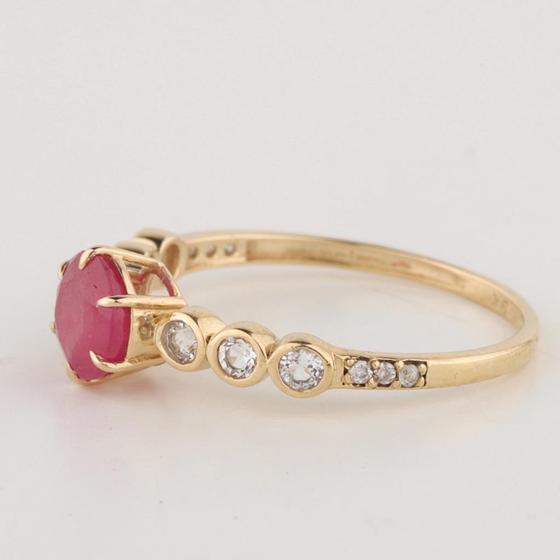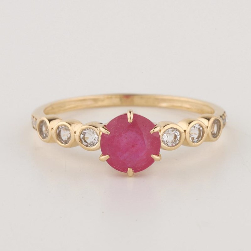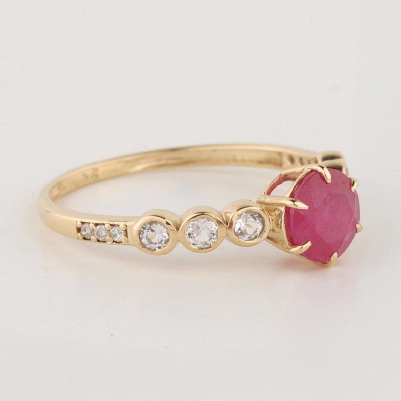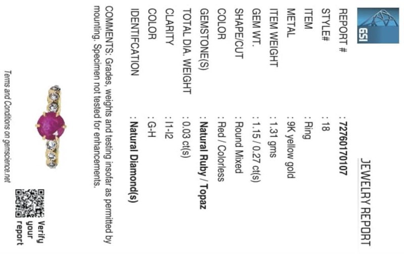 9CT YELLOW GOLD NATURAL RUBY / NATURAL WHITE TOPAZ & DIAMOND RING Weight Of The Item: 1.31 G Fineness Of Metal(S): Yellow Gold 9Kt The Ring Consists Of (1) Round Brilliant Natural Ruby & (6) Round Brilliant Cut White Topaz. Surrounding The Main Stones Are Round Brilliant Cut Natural Diamonds. Antique Style Identification: Natural Ruby / Natural White Topaz Color: Red / White Shape: Round Brilliant Cut / Round Faceted Cut No. Of Stone: 7 Dimension: 6 Mm X 6 Mm X 3.6 Mm Weight: 1.15 Carats / 0.27 Carats Identification: Natural Diamond Shape: Round Brilliant Cut Weight: 0.03 Cts Cut: Excellent 0 160640+13