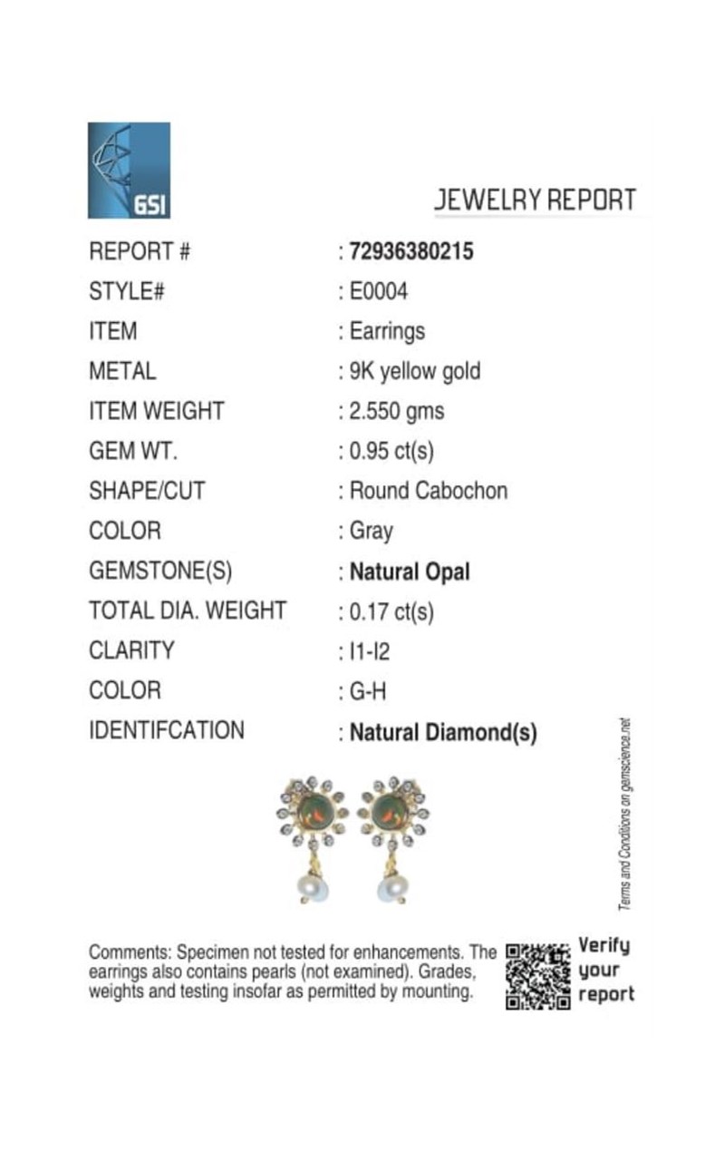 9CT YELLOW GOLD NATURAL BLACK OPAL / NATURAL PEARL & DIAMOND EARRINGS Weight Of The Item: 2.55 GFineness Of Metal(S): Yellow Gold 9KtThe Earrings Consists Of (2) Round Brilliant Natural Black Opal & (2) Round Brilliant Cut Pearl. Surrounding The Main Stones Are Round Brilliant Cut Natural Diamonds.Identification: Natural Black Opal / Natural PearlColor: Black / WhiteShape: Round Brilliant Cut / Round Faceted CutNo. Of Stone: 4Dimension: 5 Mm X 5 Mm X 3 MmWeight: 0.95 Carats / 1.43 CaratsCut: Very GoodIdentification: Natural DiamondShape: Round Brilliant CutWeight: 0.17 CtsCertificates Are Provided By Gemological Science International (Gsi), An Independent Third-Party Gemological Laboratory Based In The Usa And Recognised Among The Top 10 Gem Labs Globally Condition: Good - Refer Images 0160841+20
